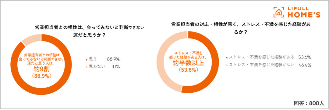 - 営業担当者との相性は運だと思っている人は約9割。これまで、営業担当者の対応・相性が悪く、ストレスや不満を感じたことがある人は半数以上。