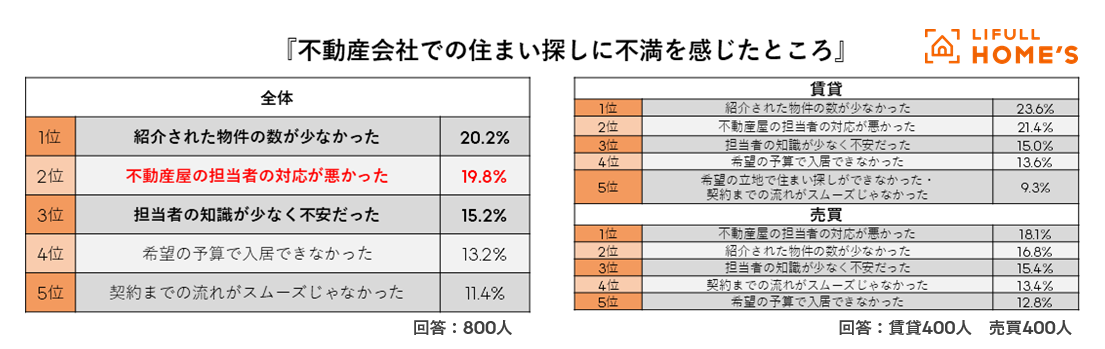 一方、不満を感じた人は「紹介された物件の数が少なかった」に『不満理由』の第1位に。