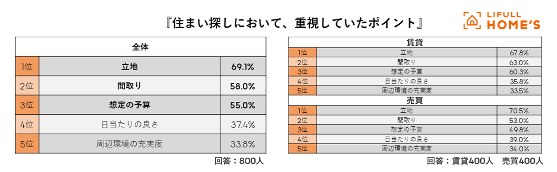 - 住まい探しで重視するポイントのTOP3は、「立地」「間取り」「想定の予算」。男女差を比べると、女性の方が住まい探しに求めるポイントが約1.2倍あることが判明。
