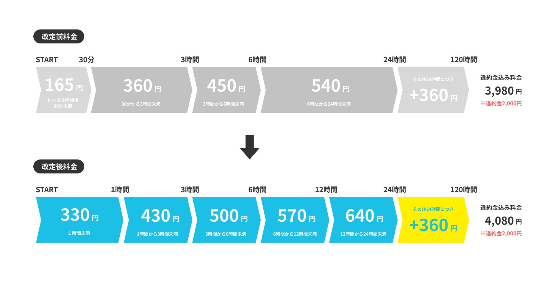 現行の料金プランでは「30分だと短すぎて返却が間に合わない」という声をいただいているほか、6割以上のユーザーさまが1時間から2時間以内の間に返却しています。このような状況を鑑み、今回の料金改定では30分以上1時間未満の利用を360円から330円に変更。短時間での利用に対して、よりメリットを感じていただける設定といたしました。