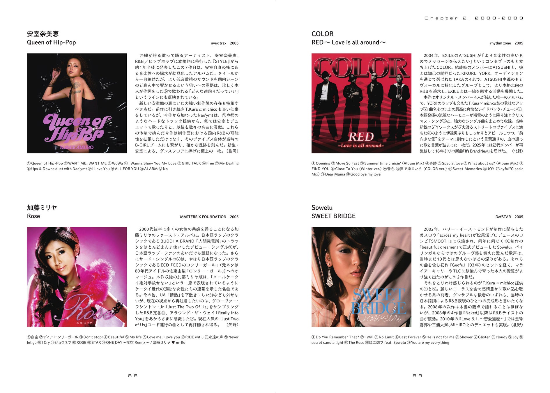 久保田利伸、DREAMS COME TRUE、UA、米倉利紀、SPEED、Chara、露崎春女、DJ HASEBE、MISIA、宇多田ヒカル、嶋野百恵、ACO、bird、ゴスペラーズ、Sugar Soul、平井堅、m-flo、CHEMISTRY、EXILE、Crystal Kay、DOUBLE、michico、SOULHEAD、L.L BROTHERS、AI、Sowelu、加藤ミリヤ、安室奈美恵、Full Of Harmony、JUJU、宏実、三浦大知、JASMINE、清水翔太、Jine、EMI MARIA、cero、星野源、WONK、Kan Sano、G.RINA、小袋成彬、STUTS、iri、向井太一、おかもとえみ、SIRUP、藤井風、VivaOla、笠原瑠斗、TENDRE、Ayumu Imazu、さらさ、aimi、3House、林和希、Yo-Sea、XG、Nenashi and more...!