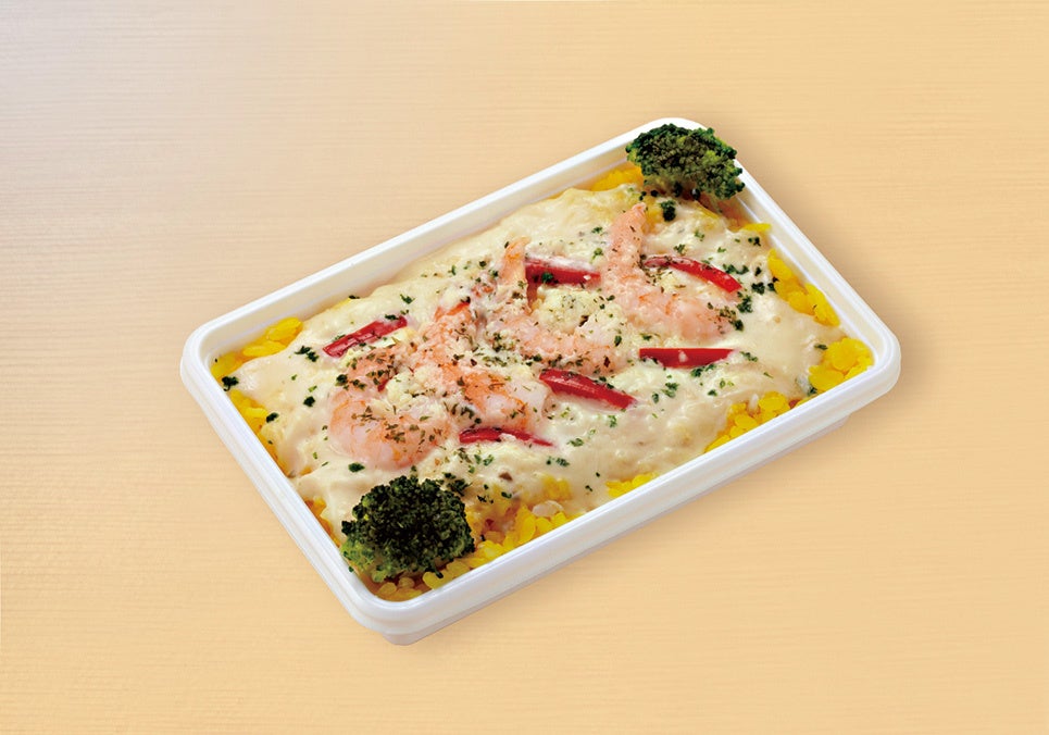柚子胡椒がアクセントのクリームソースをサフランライスにたっぷりかけたドリア風。外国人にも人気の和テイストを加えた洋食スタイル。