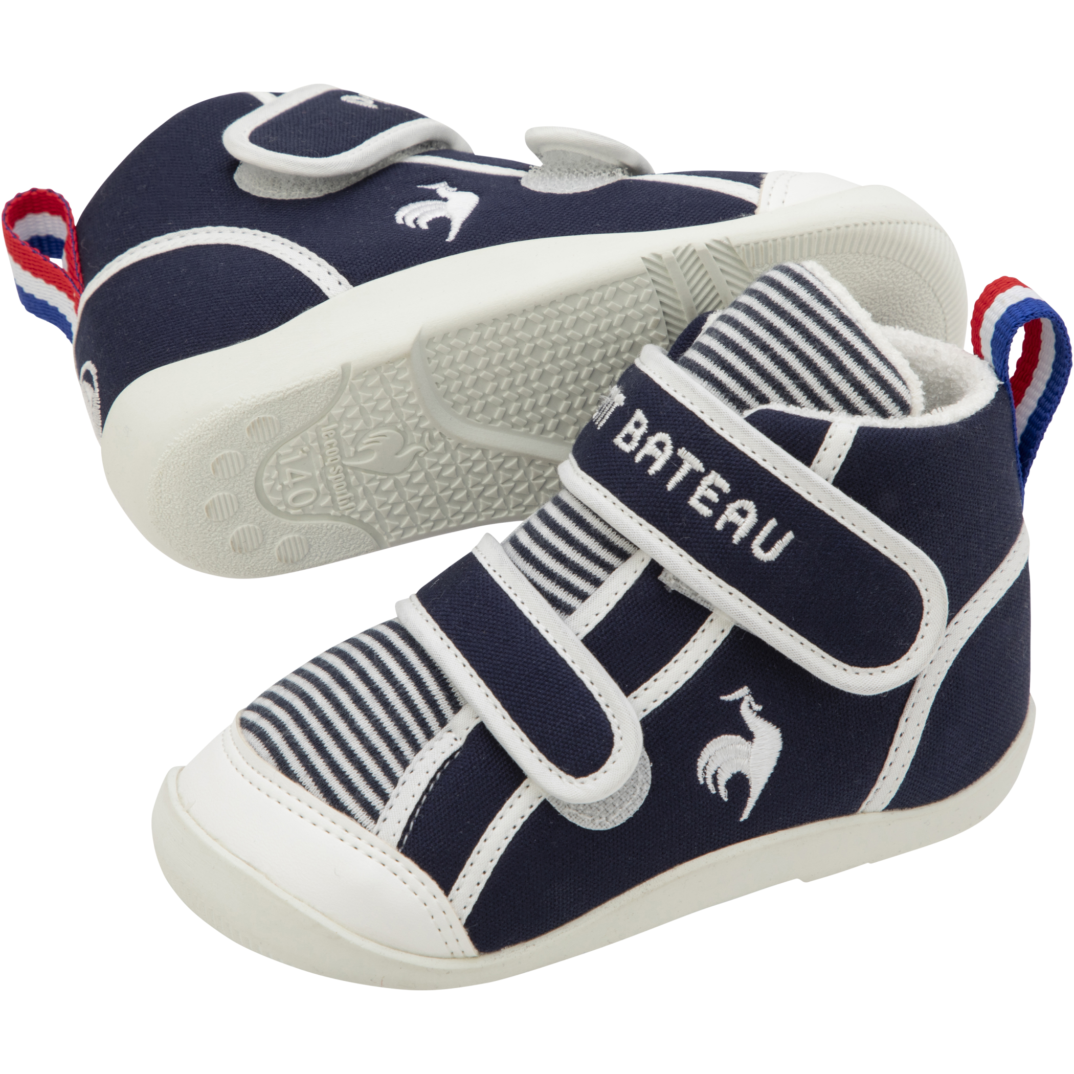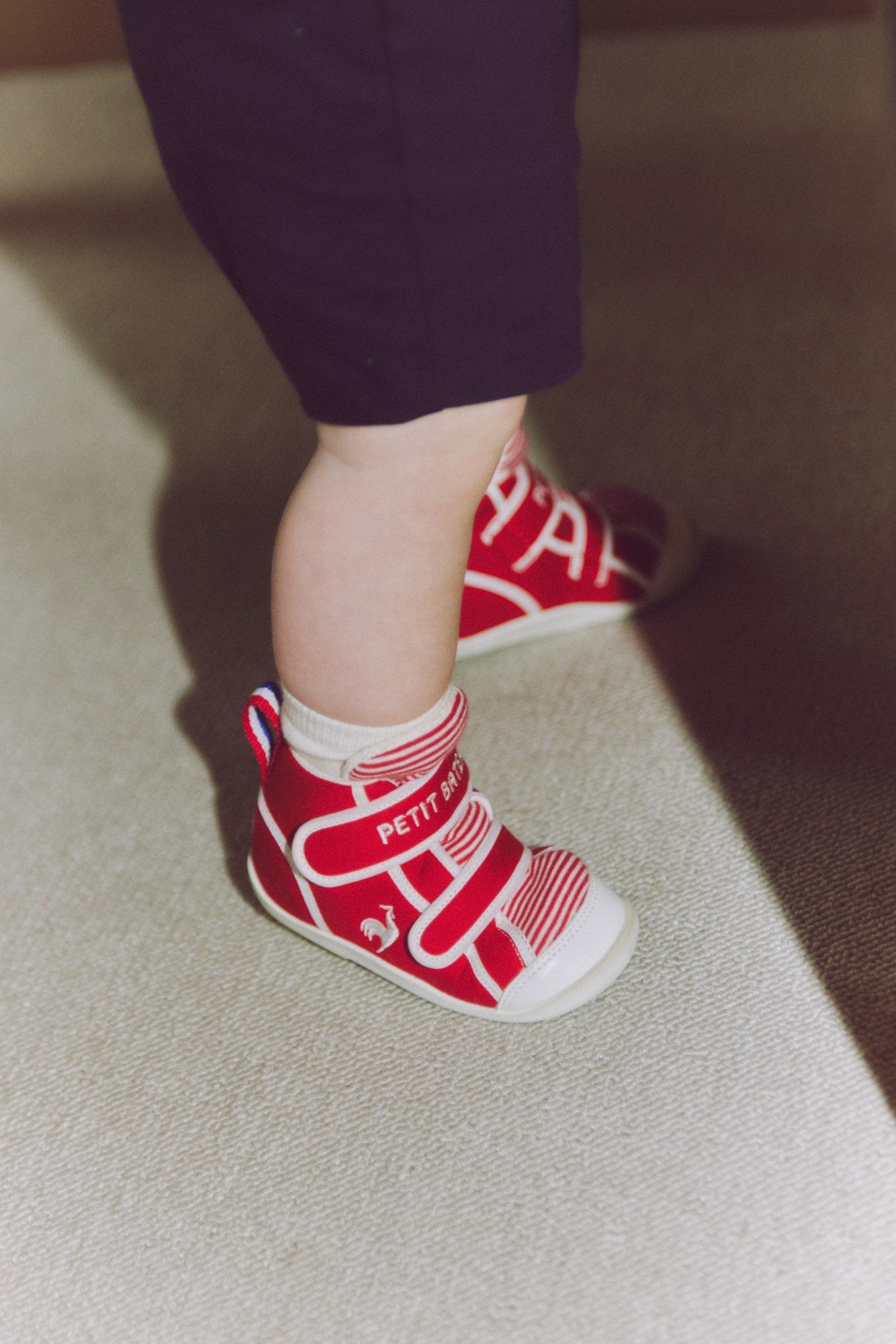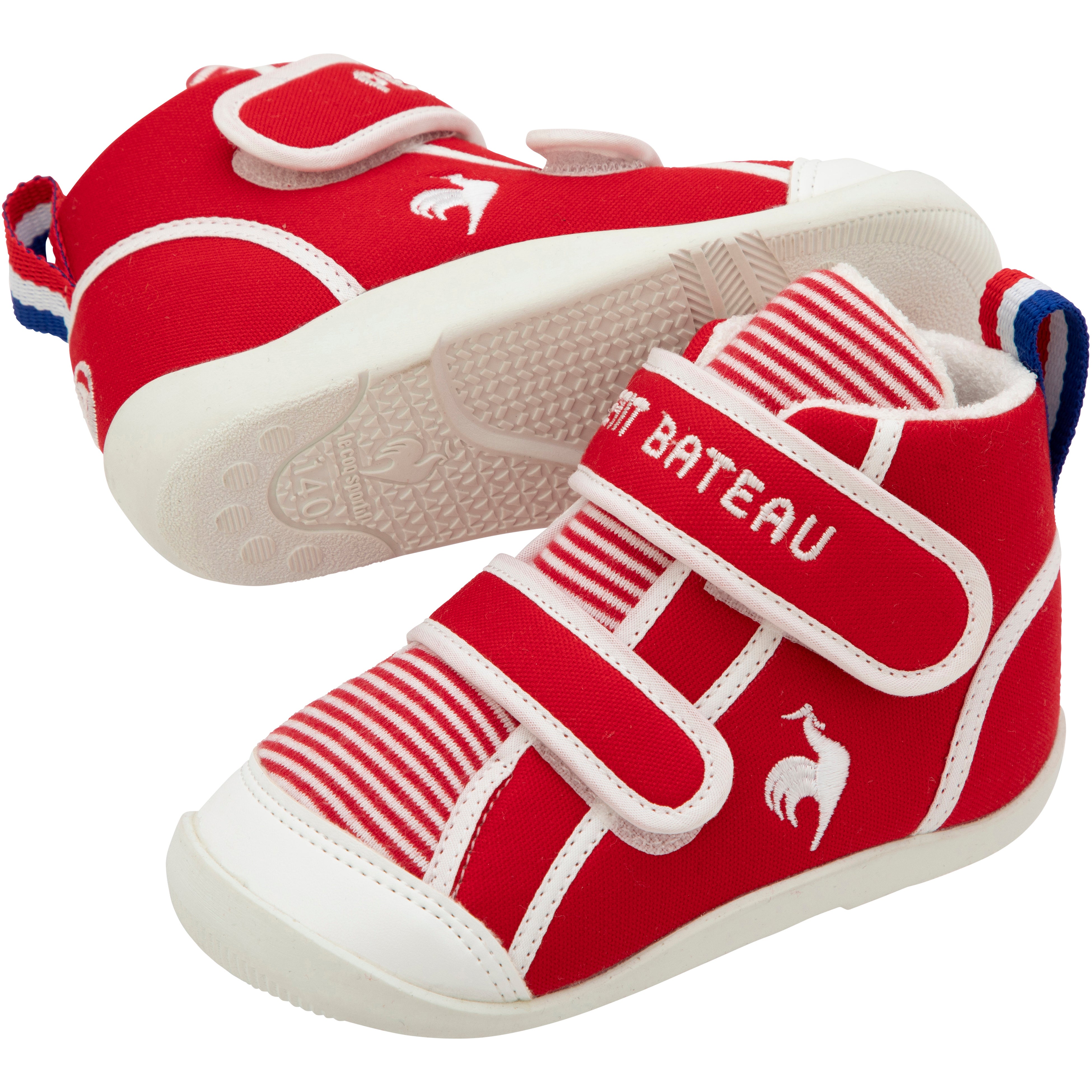 2024年、ファッションだけでなくスポーツでも盛り上がりを見せるフランスで100年以上の歴史を持つフランスブランド同士の初めてのコラボレーションモデルが登場します。2023年にキッズデザイン賞、および2024年にiFデザイン賞を受賞した『ルコックスポルティフ』のベビーシューズ「LCS CHARLES」をベースに、アッパーには『プチバトー』のアイコニックなミラレ柄生地を使用。サイドにはフランスの国鳥“雄鶏”をモチーフにした『ルコックスポルティフ』のロゴマーク、かかと部分にはヨットがモチーフの『プチバトー』のロゴマークの刺繍が施されています。フランスの温もりが香るエスプリがデザインに落とし込まれたスペシャルメイクアップです。