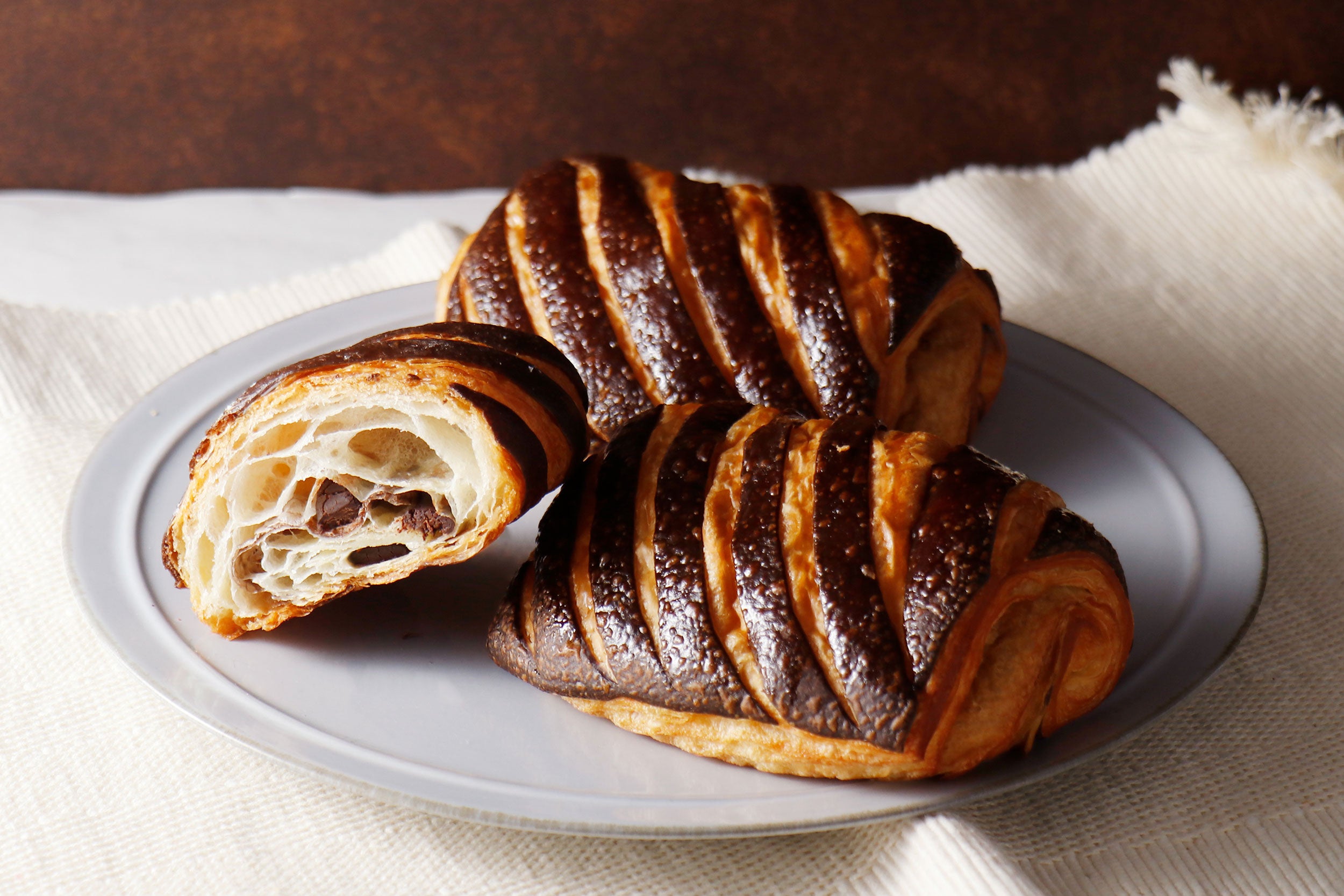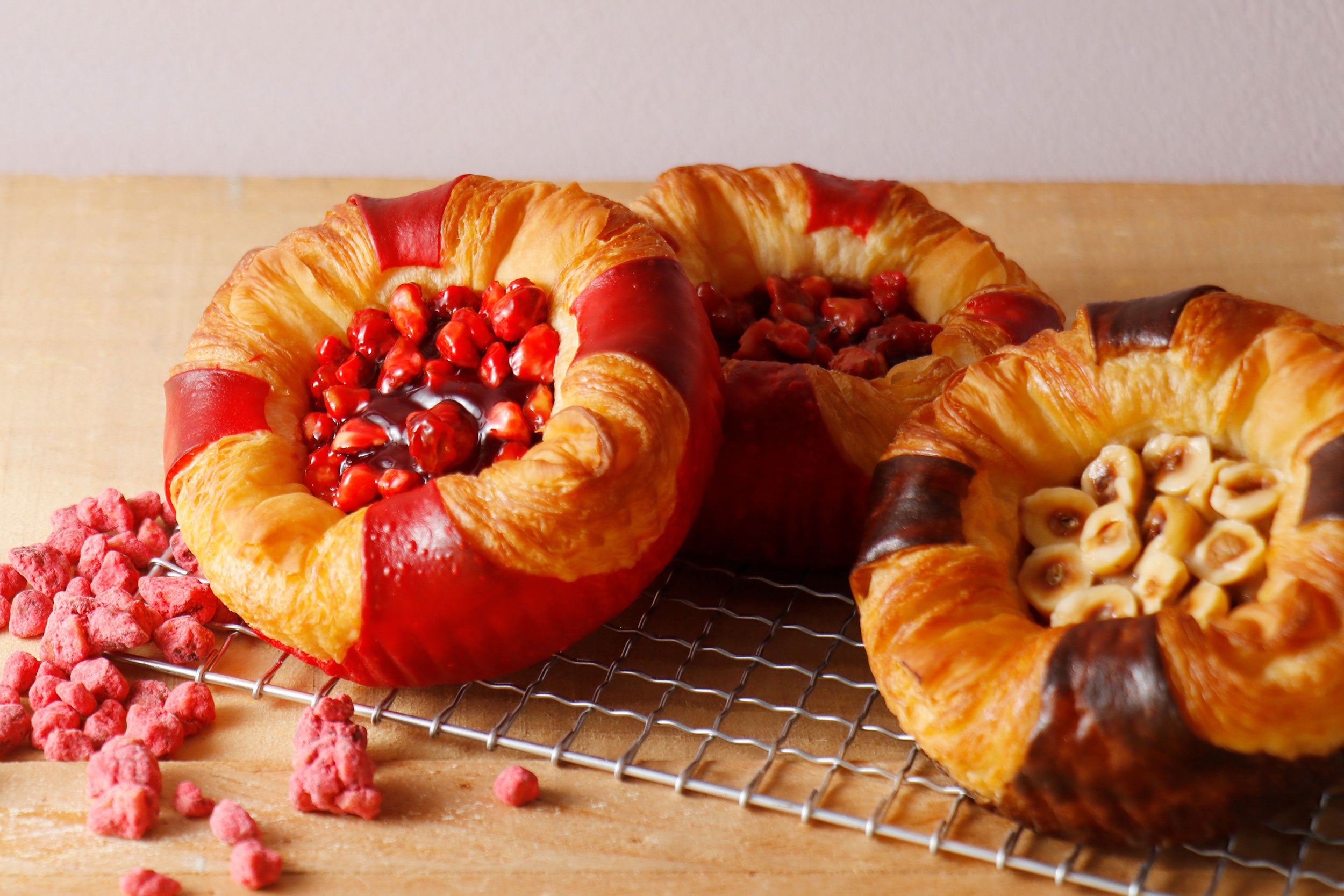 2色のクロワッサン生地にフランボワーズコンフィチュールとコンカッセの入ったパテシエール、コンカッセを合わせた「クッサンルージュ(画像左)」とヘーゼルナッツプラリネパテシエール、ヘーゼルナッツ、ローストヘーゼルナッツを合わせた「クッサンプラリネ(画像右)」