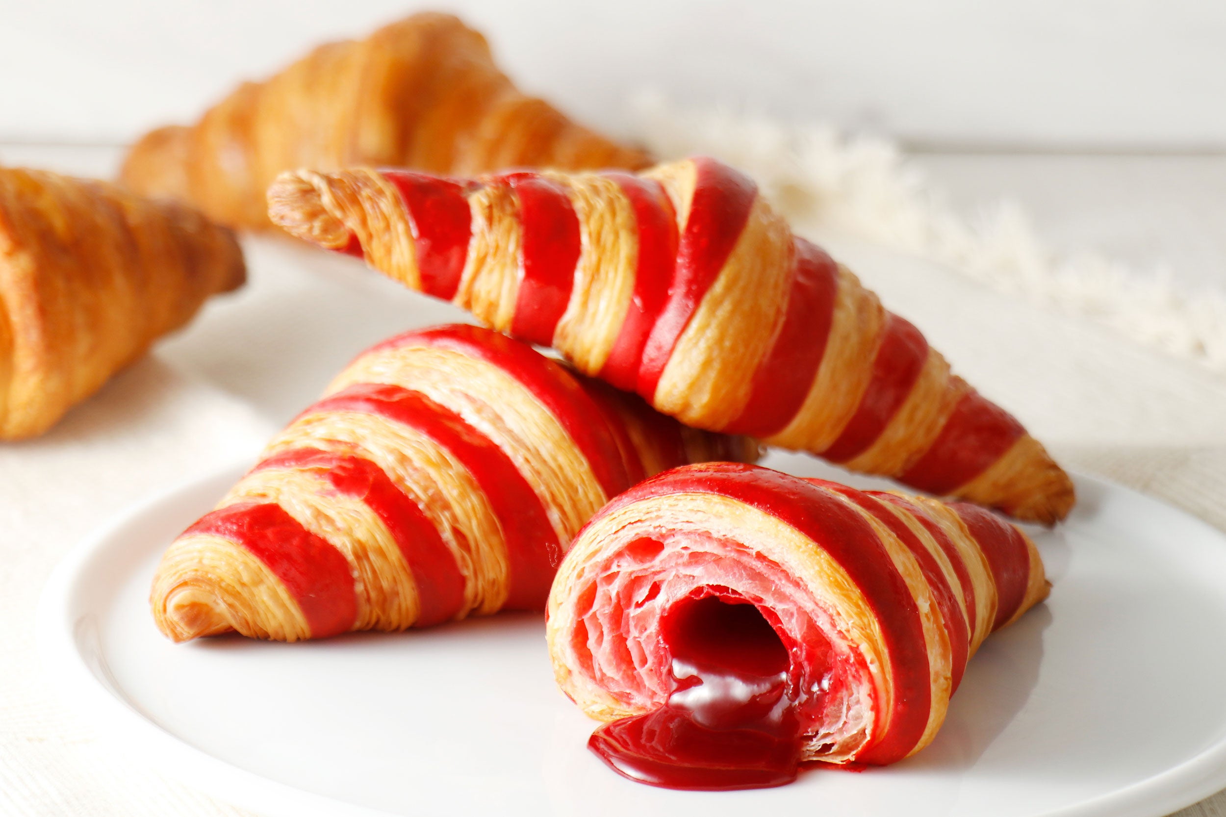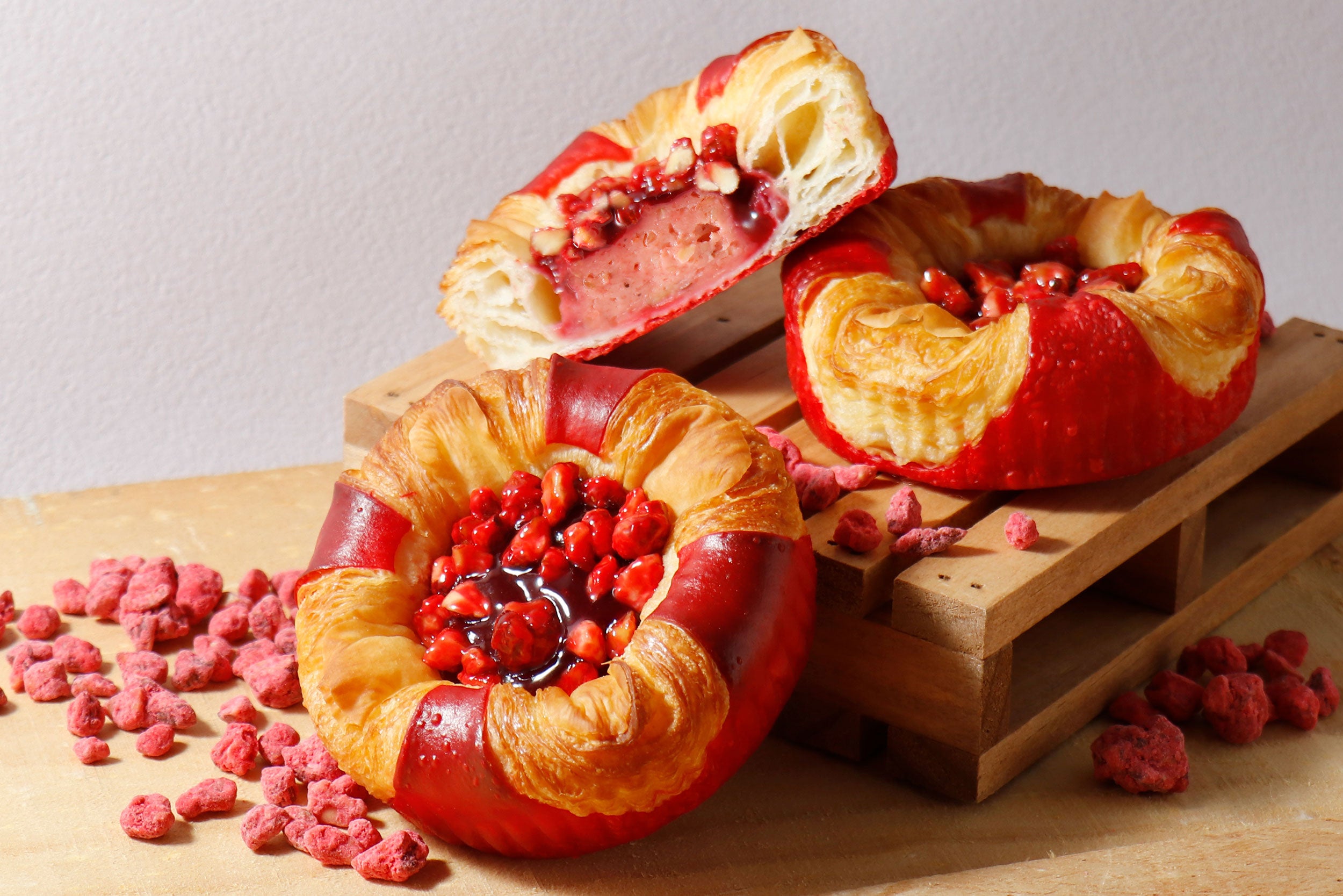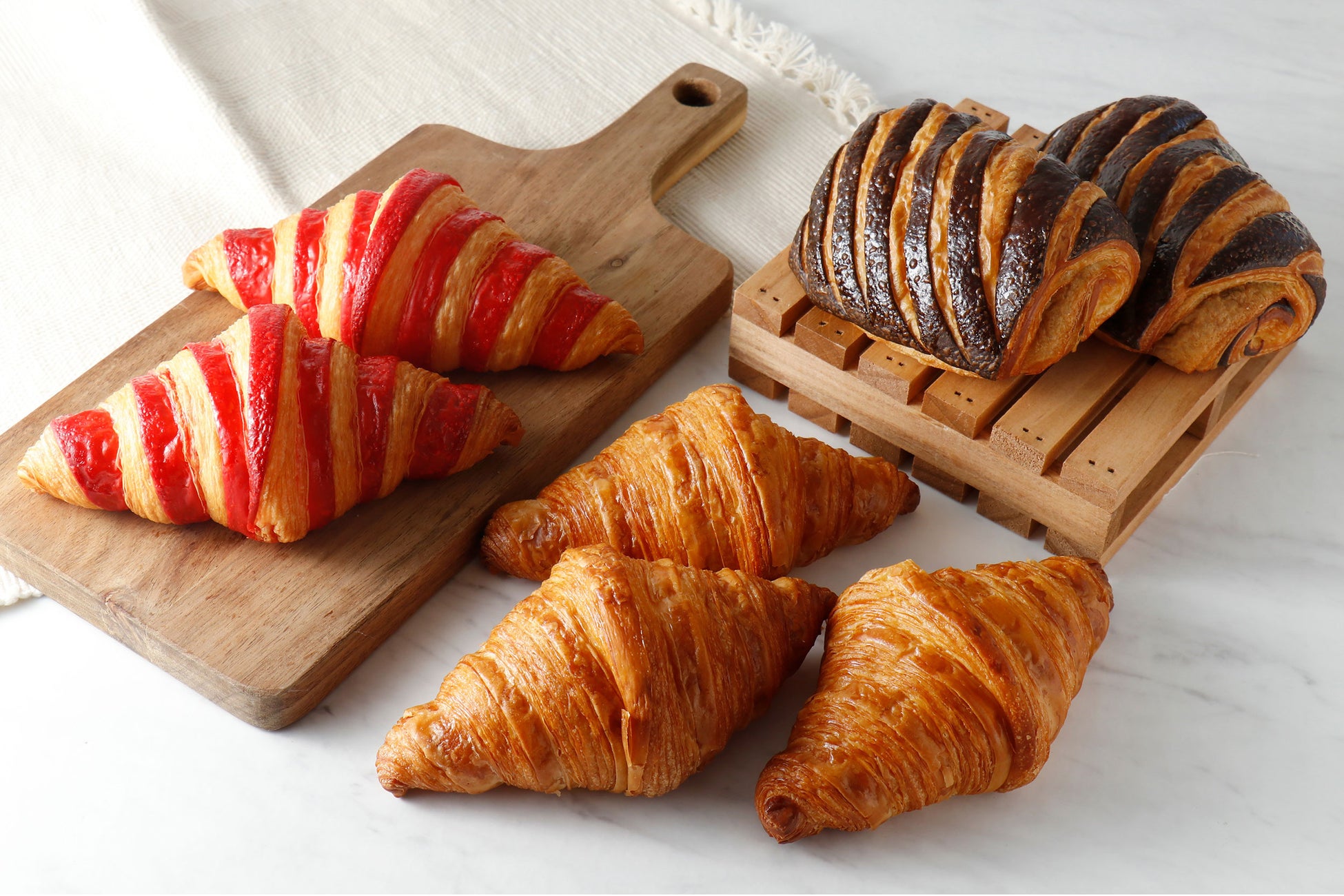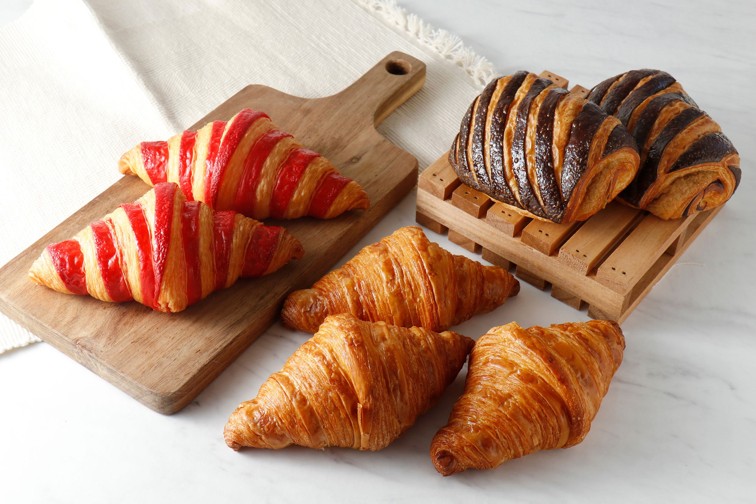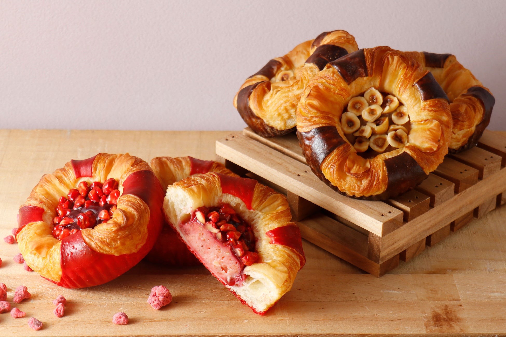 カルピスバターを使用した「クロワッサン(画像中央)」とフランボワーズのコンフィチュールがたっぷり入った「クロワッサン ベリー(画像左上)」、ビターチョコレートをクロワッサン生地で包み込み焼き上げた「パン オ ショコラ(画像右上)」