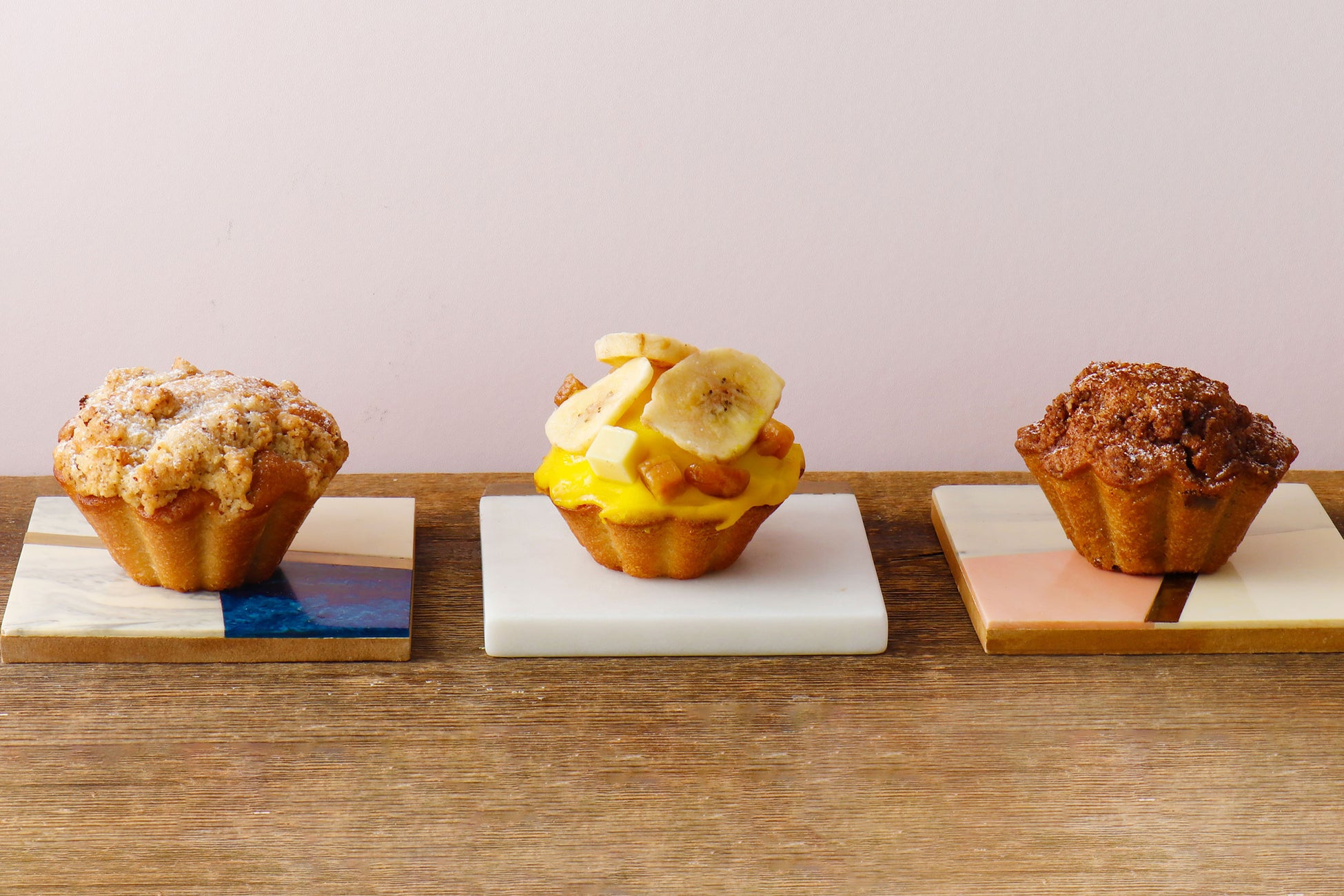 プラリネ風味の生地にヘーゼルナッツ風味のクランブルをのせた「プラリネアマンド(画像左)」、バナナ風味の生地に甘いバナナと酸っぱいレモンチョコをのせた「バナーヌ(画像中央)」、コーヒー風味の生地にチョコとクランブルをのせた「カプチーノ(画像右)」