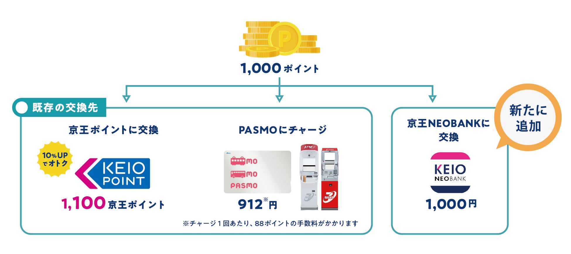 「京王NEOBANK」の口座をお持ちのお客さまは、1ポイントあたり1円に交換いただけます。京王NEOBANK支店の口座番号をご用意のうえ、京王アプリ内 京王トレインポイント専用ページにて「京王NEOBANK交換」を選択しご利用ください。