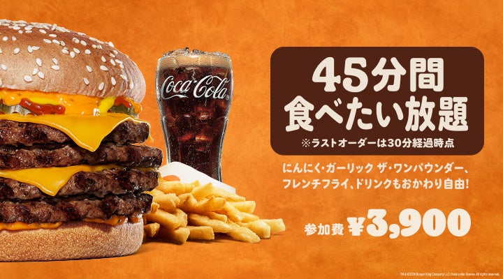 『にんにく・ガーリック ザ・ワンパウンダー』、フレンチフライ(M)、ドリンク(M)各商品を、それぞれ完食していることを条件に、いずれも制限時間45分以内でおかわり自由の食べたい放題イベントです。