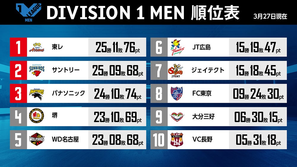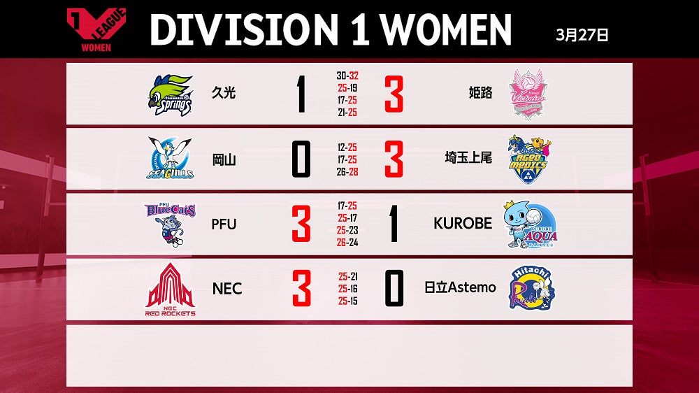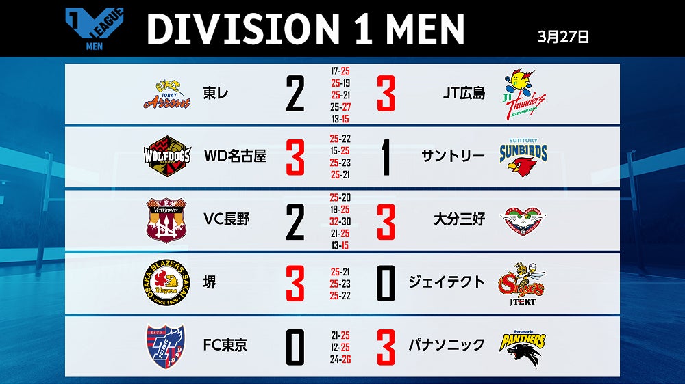 バレーボール国内最高峰リーグ V.LEAGUE【3月27日の試合結果】