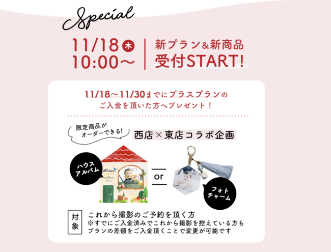 今後の新規撮影予約はもちろん、すでにご予約・ご入金済みで撮影を控えている方も、プランの変更を承ることが可能です。