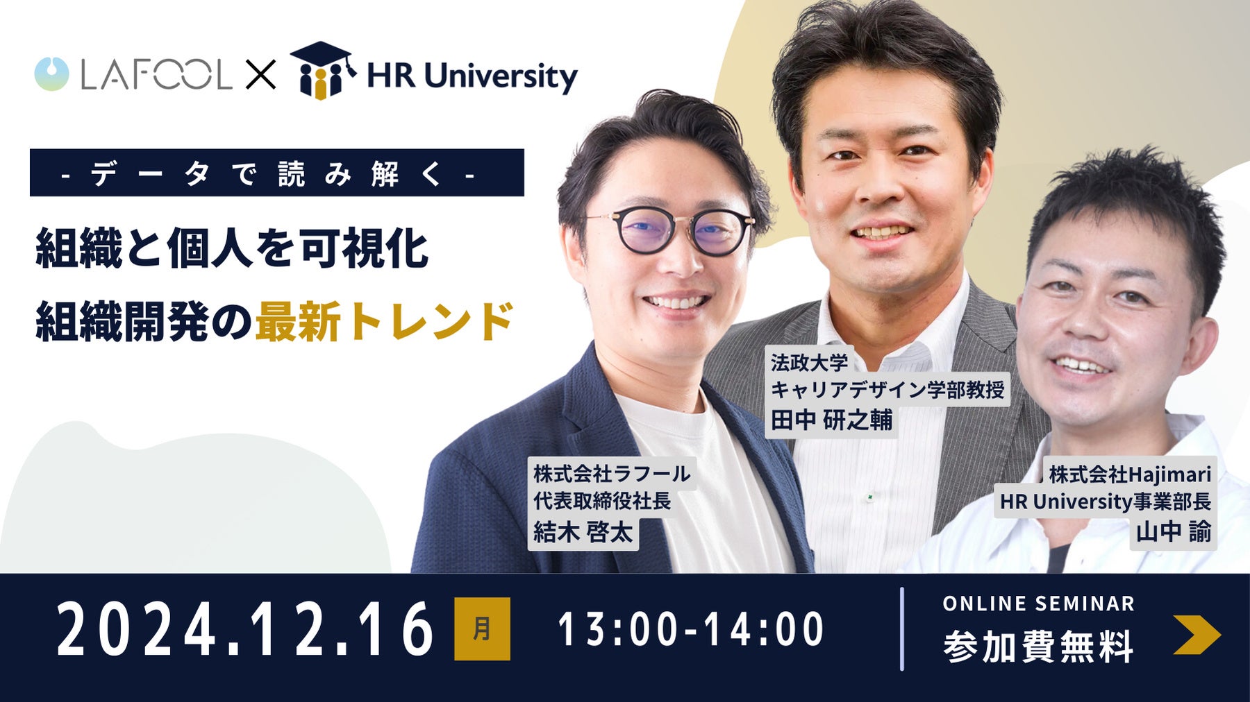 今回、法政大学キャリアデザイン学部教授で社外取締役・社外顧問を33社歴任、著書32冊著書を出版されているタナケン先生と組織と、人材のビッグデータによる分析力で企業の強みを伸ばし、人的資本/ウェルビーイング経営支援を行うラフール社代表取締役結木氏をお招きして、人事を網羅的・体系的に学べる伴走型総合研修プラットフォーム「HR University」を運営するHajimari社 執行役員の山中氏と共に熱く議論を重ねます。