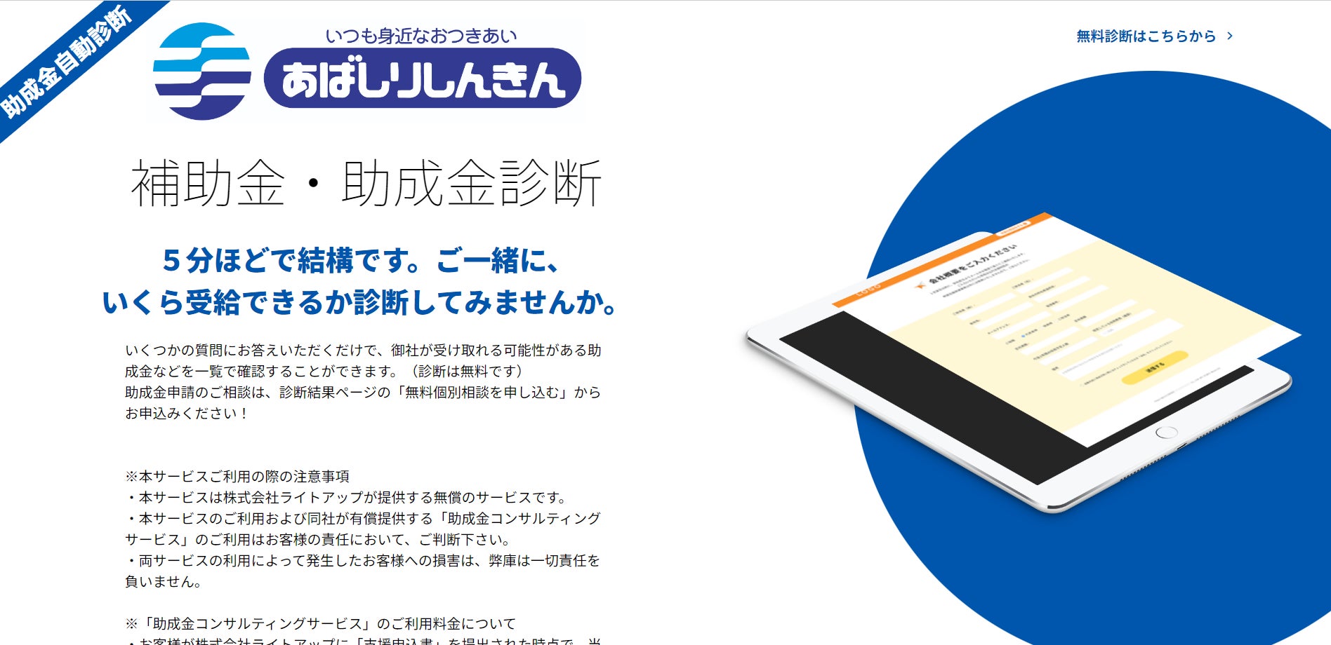 新型コロナウイルス感染症対応制度も含め、最新の補助金・助成金を各企業ごとに自動診断できるシステムをご提供いたします。インターネット上で、各企業ごとに受給可能性が高い補助金・助成金を、無料で、数分で調べることが可能となります。