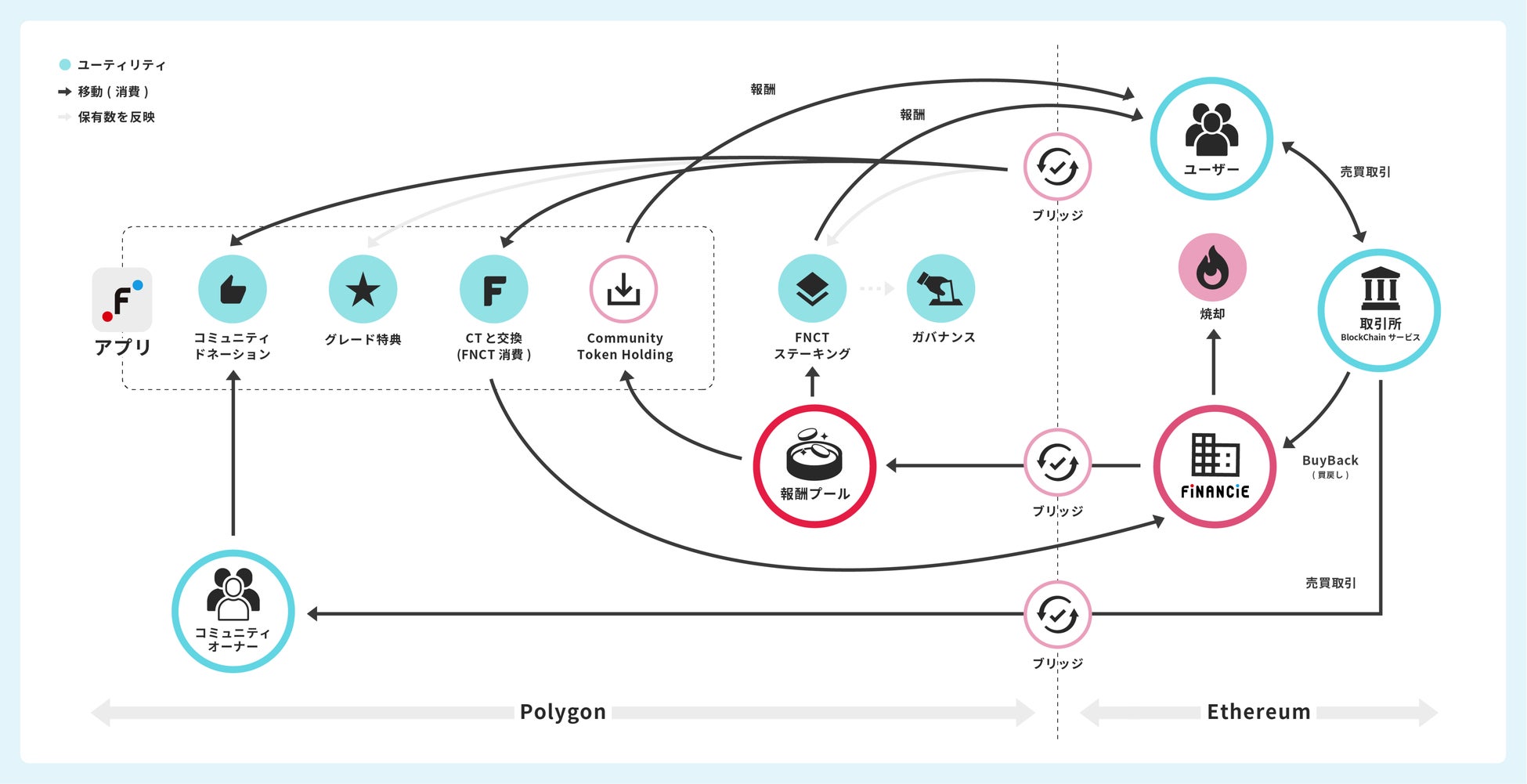 FNCTの具体的な活用例としては、FiNANCiEのユーザーに報酬として付与したり、FiNANCiE上の優良なコミュニティが継続的に成長するためのインセンティブとして使用するなどを予定しています。また、FNCTはFiNANCiEのエコシステム全体におけるガバナンスに参加できる機能も有し、「ユーザー主体の運営」の実現に寄与します。