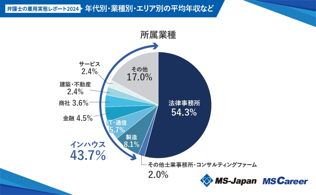 上記は2023年6月~2024年5月に「MS Agent」に登録している弁護士が、現在所属している業種の調査結果です。