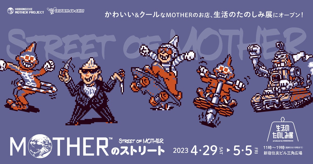 2023年4月29日(土・祝)~5月5日(金・祝)まで開催される生活のたのしみ展で、「ほぼ日MOTHERプロジェクト」は『MOTHER』シリーズの世界観とストリートカルチャーをクロスさせて、にぎやかでわくわくするようなお店、「MOTHERのストリート」をつくります。年に一度の大きなイベントですから、たくさんの新商品を用意しています。