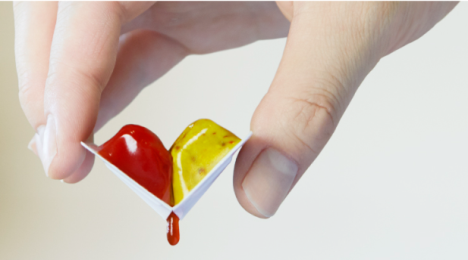 ソーセージと相性の良いトマトソースとあらびきマスタードが一つになり、片手でパキッと簡単に中身が絞り出せます。