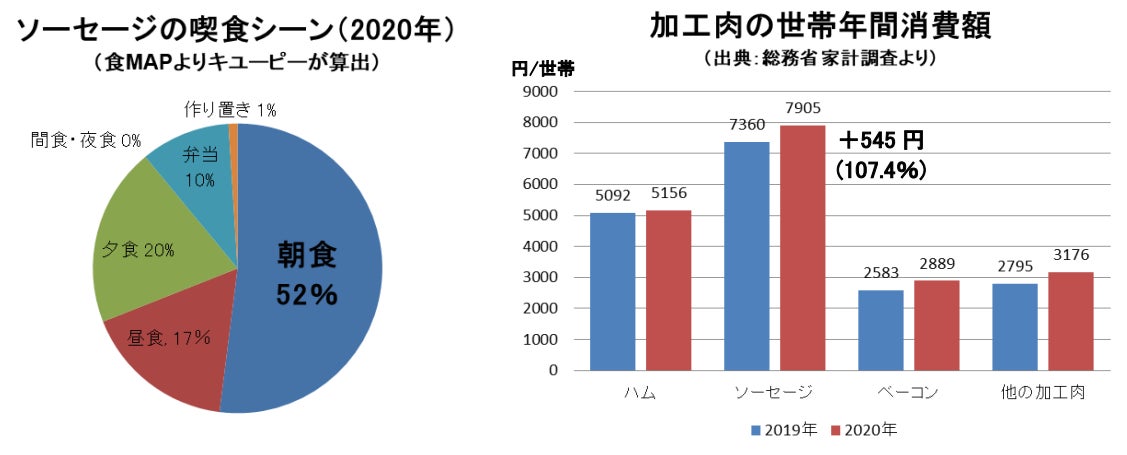ソーセージなど朝食での使用頻度が高い加工肉は、コロナ下の外出自粛やリモートワーク増加の影響もあり、消費額が伸長しています。特にソーセージは世帯年間消費額が高く、2020年は2019年に比べて、545円増加しており、前年対比で約107%となっています。