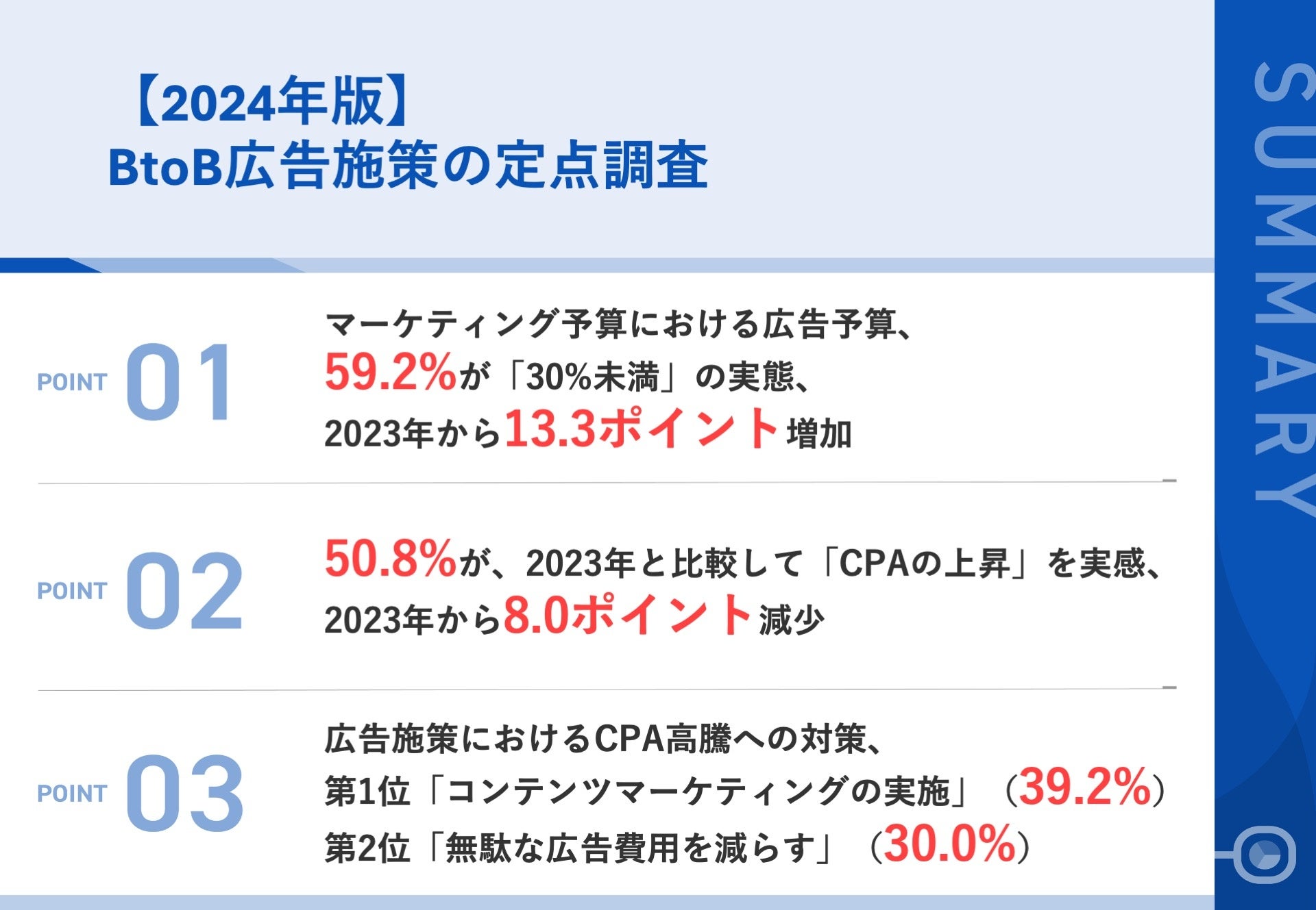 【調査レポート|2024年BtoB企業の広告施策の実態】2024年広告予算について、「30%未満」が59.2%、2023年比13.3ポイント増!高騰するCPA対策も明らかに