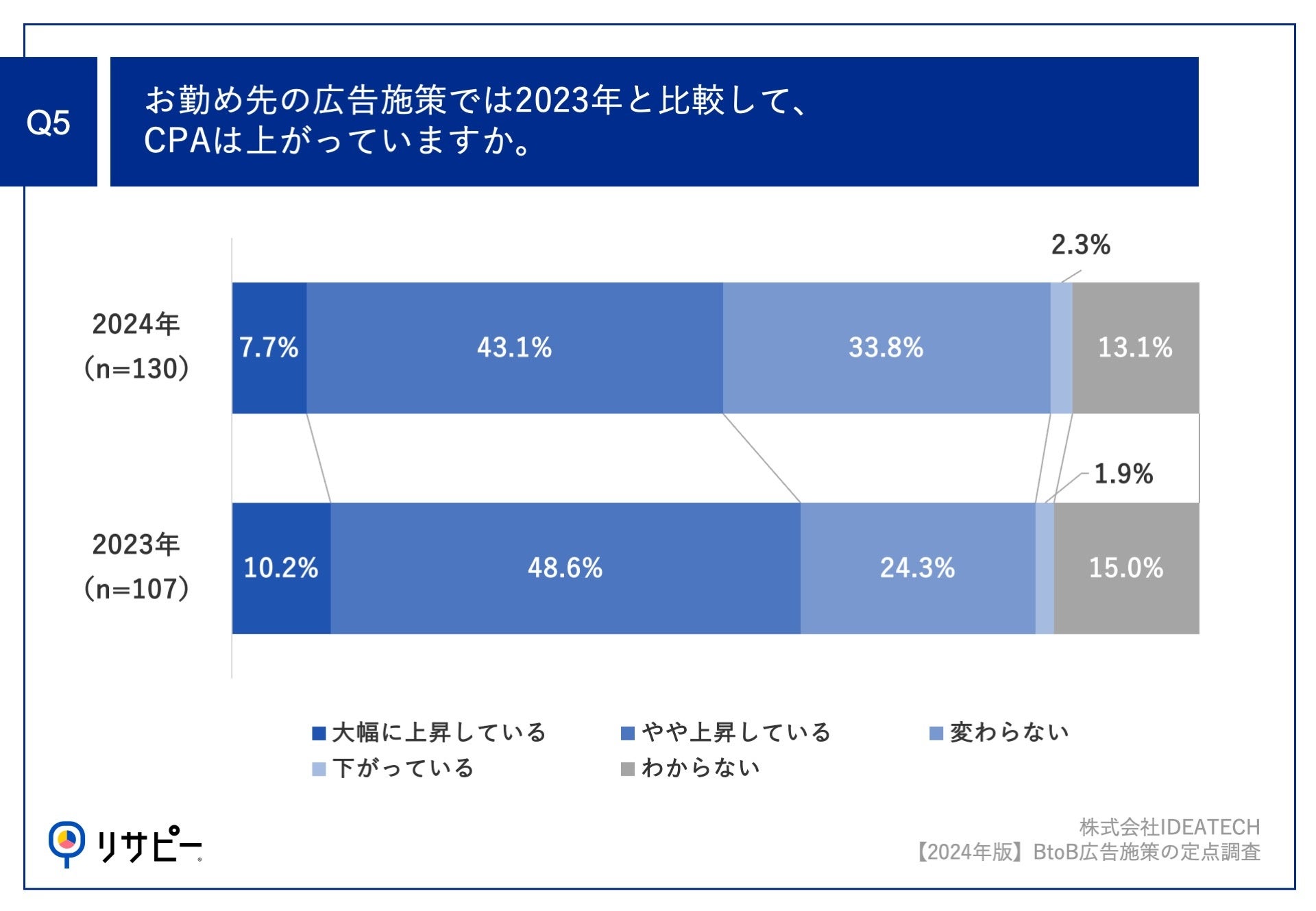 「Q5.お勤め先の広告施策では2023年と比較して、CPAは上がっていますか。」(n=130)と質問したところ、「大幅に上昇している」が7.7%、「やや上昇している」が43.1%という回答となりました。