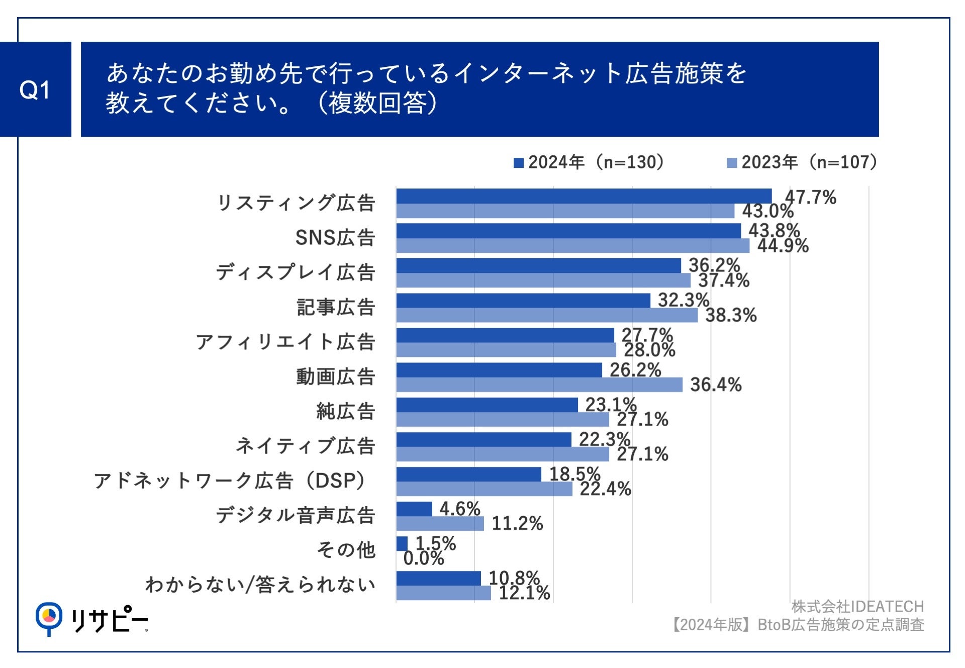 ワンストップでリサーチデータマーケティングを実現する「リサピー®️」(https://ideatech.jp/service/research-pr)を運営する株式会社IDEATECH(本社:東京都港区、代表取締役社長:石川友夫)は、BtoB事業の広告担当者130名を対象に、【2024年版】BtoB広告施策の定点調査を実施しましたので、お知らせいたします。