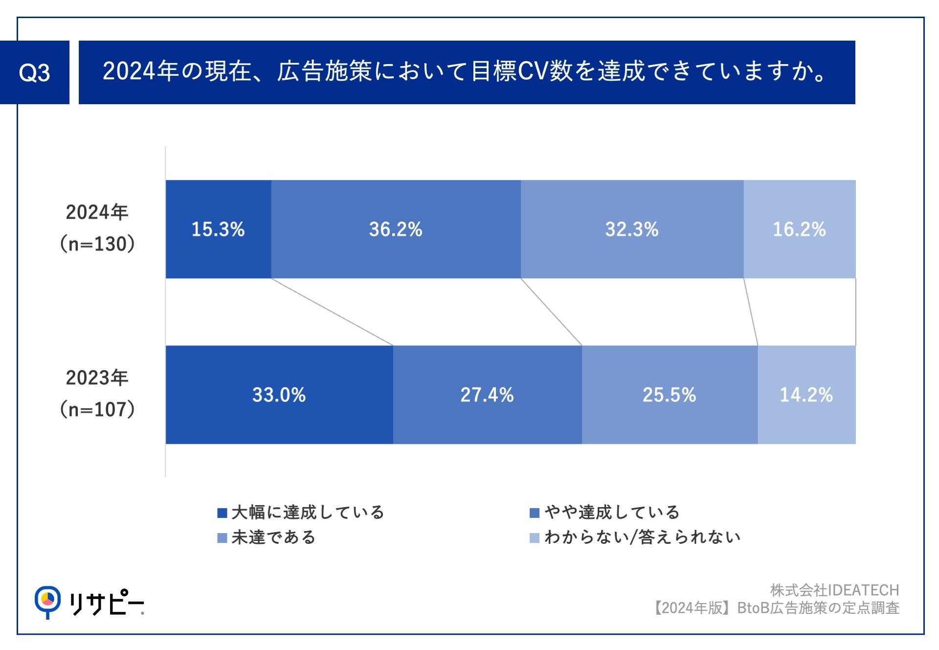「Q3.2024年の現在、広告施策において目標CV数を達成できていますか。」(n=130)と質問したところ、「大幅に達成している」が15.3%、「やや達成している」が36.2%という回答となりました。