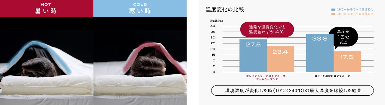 質の高い睡眠に必要な環境は気温・湿度・日照時間といった季節要因によって変化し、屋外の気温・湿度の変化は室内ひいては寝床内の温度・湿度にも大きく影響を及ぼします。※1 体感温度や好みの寝室環境は個人によっても、居住地域によっても異なります。睡眠においては、年間を通して環境の変化を最低限にして睡眠の質を高めることが重要であり、また同じシリーズの寝具を継続使用することは、睡眠のルーティンを持つという観点でも大切です。