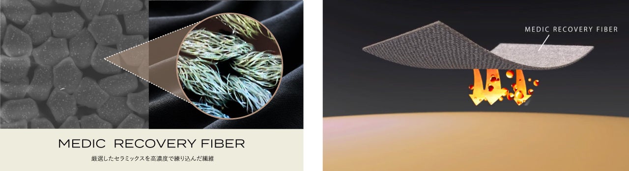 天然鉱物を原料とするセラミックス。その中でも純度の高い厳選したセラミックスを数種類ブレンドし、繊維に高濃度に練り込んだ「MEDIC RECOVERY FIBER」を独自開発。さらに、特殊な糸形状により体温の吸収と遠赤外線放射を高めることで、効果的に体を温め、血行を促進しやすくし、高いリカバリー効果を実現しました。また、唾液アミラーゼ活性値測定では交感神経の活性度と相関する唾液アミラーゼの優位性がみられて、リラックス度アップの期待もあります。