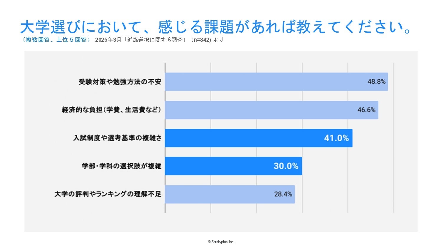また、昨年の高校3年生・大学生の「Studyplus」ユーザー(2025年3月時点)を対象に実施したアンケートによると、大学選びにおける課題として「受験対策や勉強方法の不安」(48.8%)「経済的な負担(学費、生活費など)」(46.6%)に次いで「入試制度や選考基準の複雑さ」(41.0%)「学部・学科の選択肢が複雑」(30.0%)をあげています。