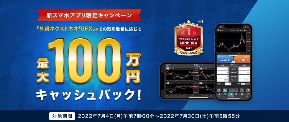 新スマホアプリ『外貨ネクストネオ「GFX」』における対象通貨ペアの新規注文の取引数量に応じて、最大100万円キャッシュバックいたします。