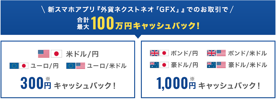 新スマホアプリ『外貨ネクストネオ「GFX」』でのお取引で最大100万円キャッシュバック!米ドル/円を含む人気7通貨ペアが対象!