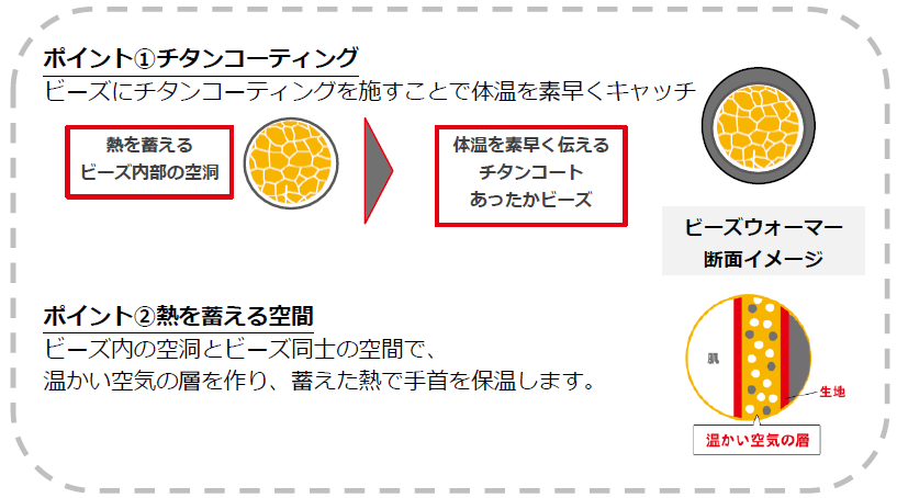 ・体温を素早く伝えるビーズが、手首をやさしく包みこんで保温