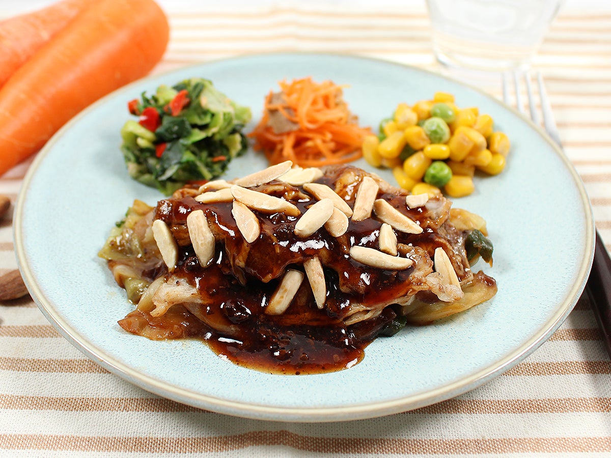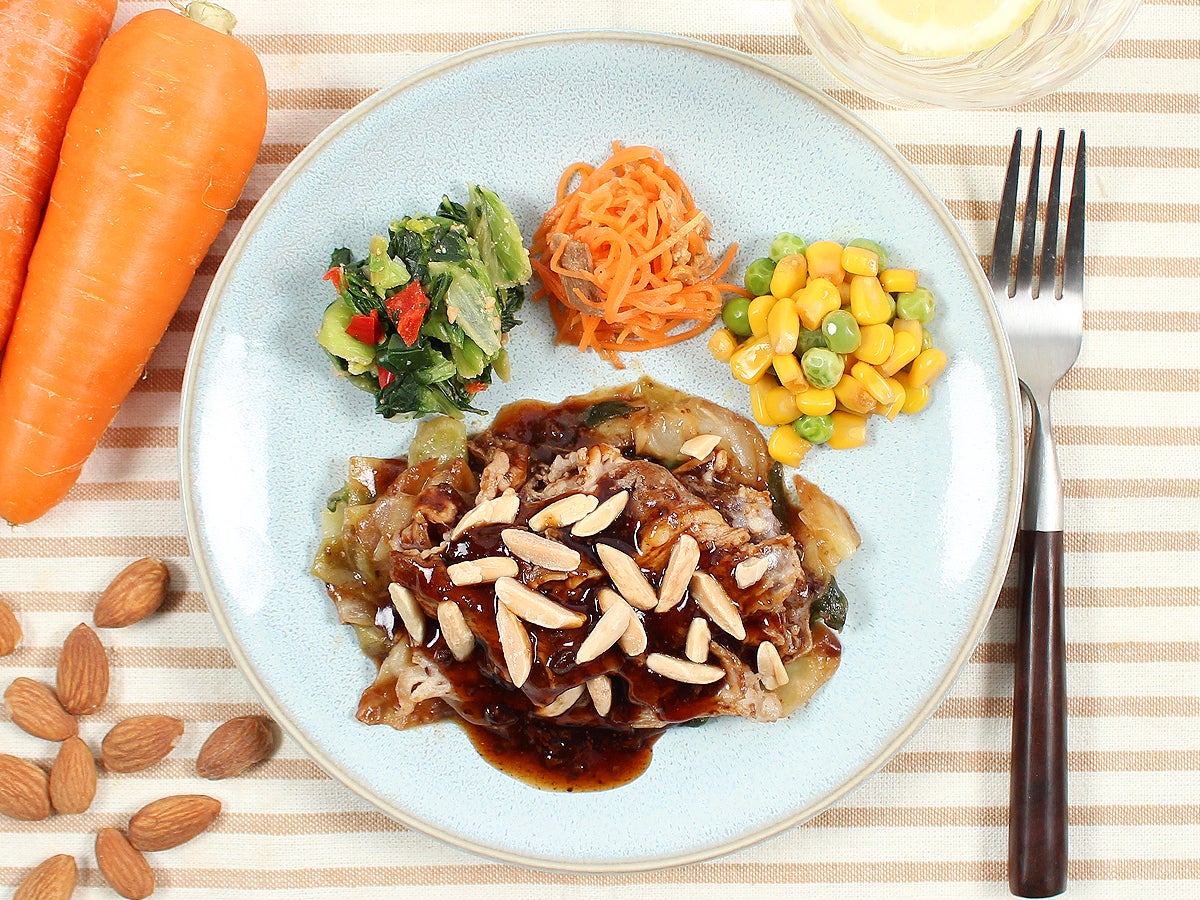 にんにく塩だれで味付けたキャベツの上に薄くスライスした牛バラ肉をのせて、香り豊かで濃厚な豆鼓ソースをかけました。トッピングには粗く刻んだアーモンドを使用しております。アーモンドの食感と、豆鼓ソースの風味をお楽しみください。