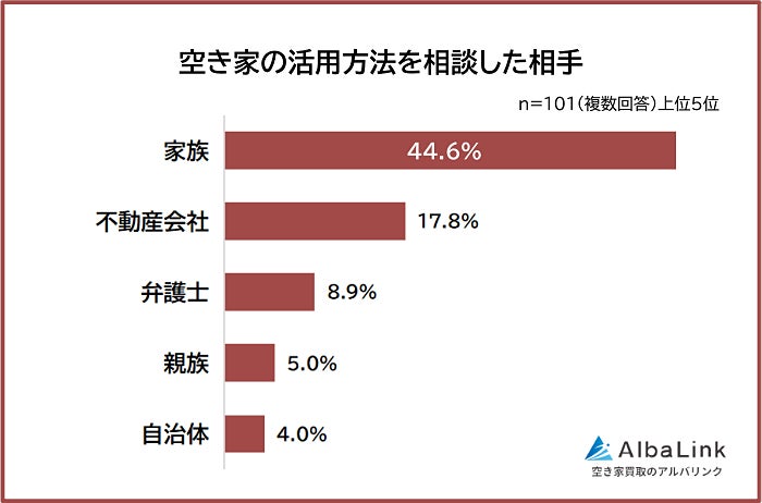 「空き家の活用方法を相談した相手」1位は「家族(44.6%)」でした。家族とは、親や自分と同じように相続人となった兄弟姉妹、配偶者、子どもなどです。