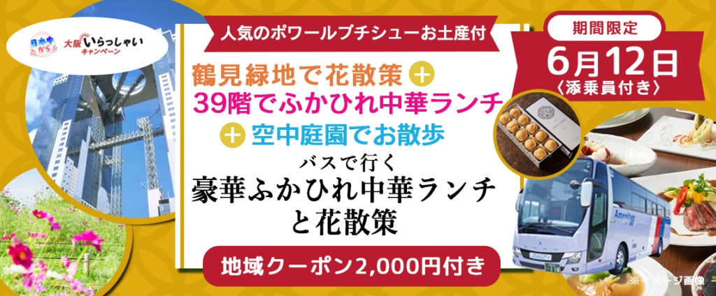 6月12日(月)限定《大阪いらっしゃいキャンペーン》鶴見緑地で花散策+ 39階でふかひれ中華ランチ+ 空中庭園お散歩 バスで行く 『豪華ふかひれ中華ランチと花散策』人気のポワールプチシューお土産付