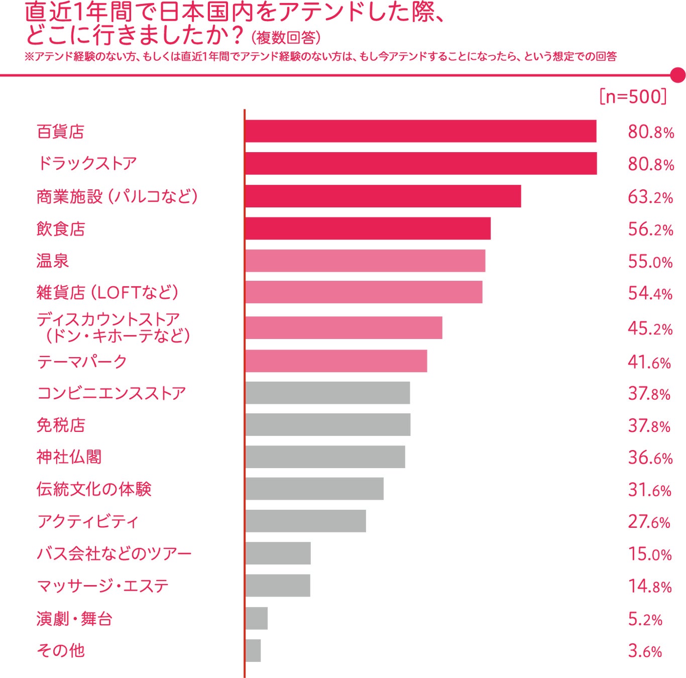 また、直近1年間のアテンド経験の有無に関わらず、実際に行ったアテンド先、およびもしアテンドするとした場合のアテンド先候補を聞いたところ、「百貨店」「ドラッグストア」「商業施設(パルコなど)」といったモノ消費に繋がる場所の人気が高いことがわかりました。「温泉」「テーマパーク」「神社仏閣」「伝統文化の体験」など、体験に通じるコト消費の割合も多いですが、コロナ前に「爆買い」と言われていた状況からは変わったとは言え、今でも安定的にモノ消費の割合が多いことがわかります。