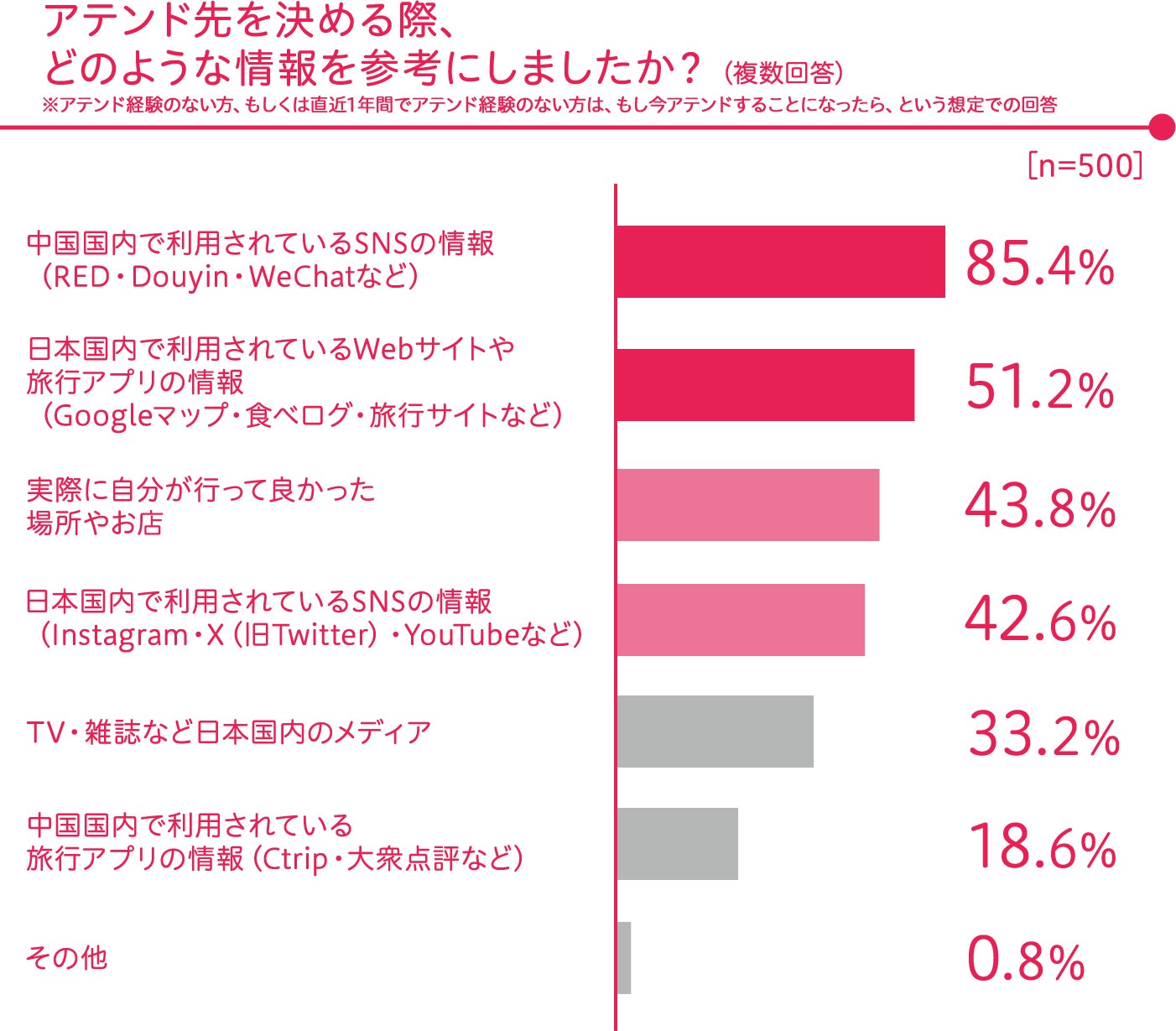 直近1年間のアテンド経験の有無に関わらず、日本国内をアテンドする際どのような情報を参考にするか聞いたところ、約85%が「中国国内で利用されているSNSの情報(RED・Douyin・WeChatなど)」と回答しました。続いて第二位が「日本国内で利用されているWebサイトや旅行アプリの情報(Googleマップ・食べログ・旅行サイトなど)」、第三位が「実際に自分が行って良かった場所やお店」となっており、TVや雑誌よりSNSやネット上の口コミを重視していることがわかります。