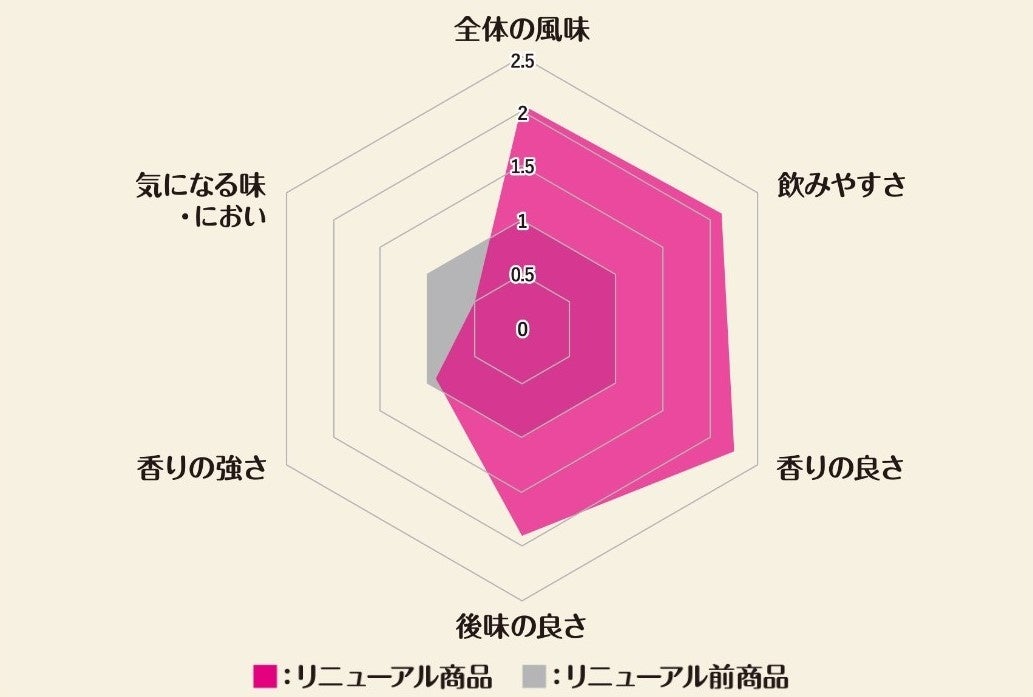 従来品と比較してコーヒーに溶かした時に気になる味やにおいが減少し、全体の風味や香りの良さ、後味の良さが改善されたことで、さらに飲みやすいコラーゲンパウダーに仕上がりました。