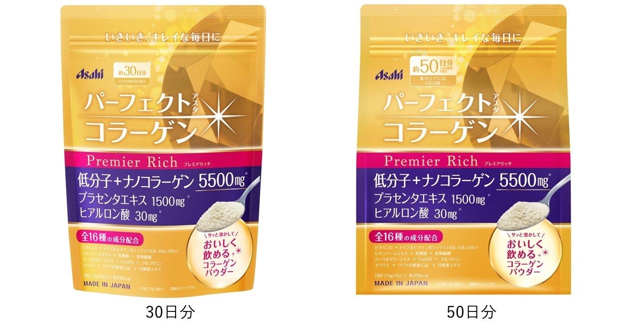 アサヒグループ食品株式会社(本社 東京、社長 川原浩)は、「パーフェクトアスタコラーゲン」ブランドから、16種の美容系成分が配合されたコラーゲンパウダー『パーフェクトアスタコラーゲン パウダー プレミアリッチ 30日分』『パーフェクトアスタコラーゲン パウダー プレミアリッチ 50日分』を9月下旬製造分から順次切り替えて販売します。