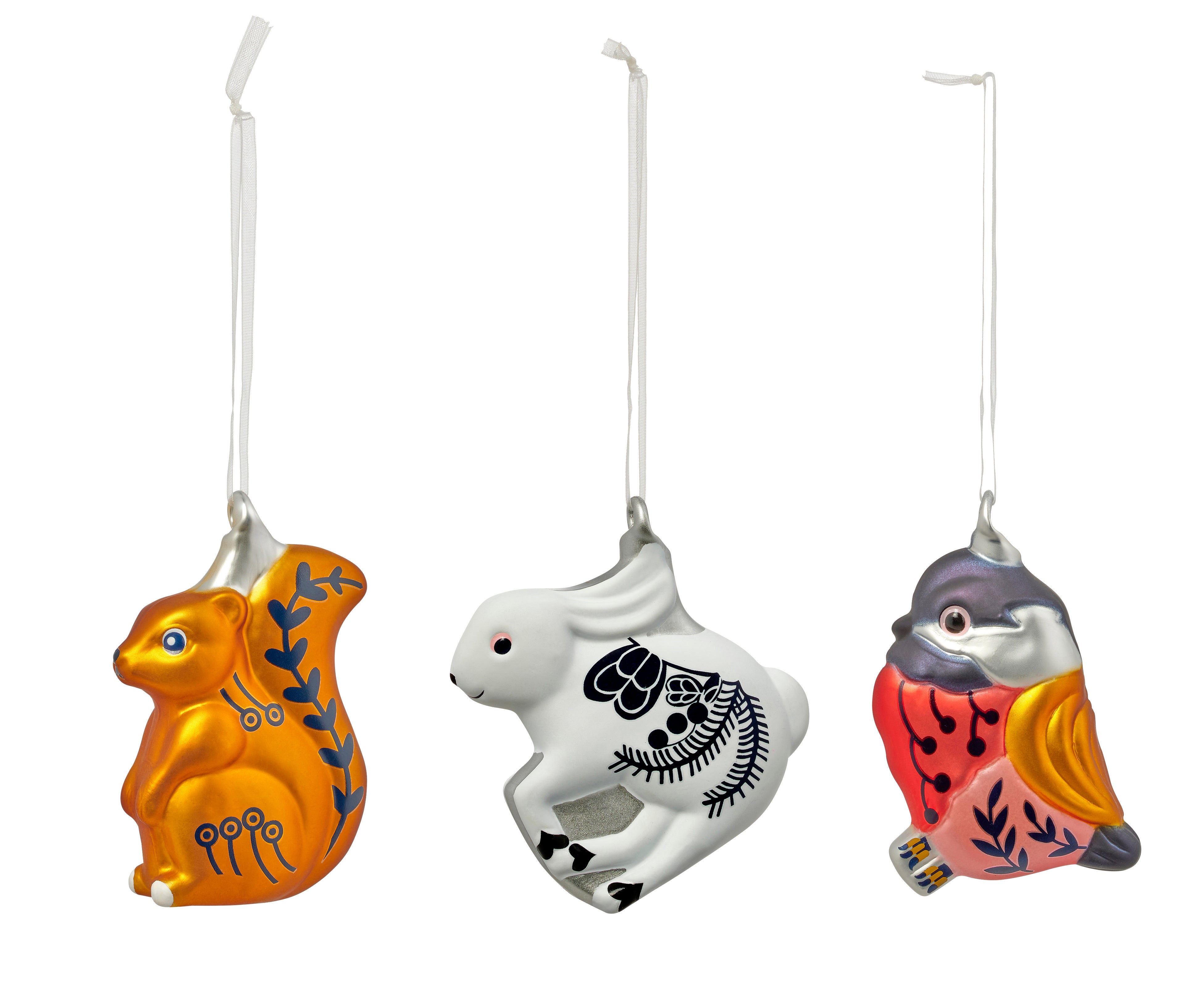 北欧の森に生息するかわいらしい3種類の動物たち(リス・うさぎ・鳥)をモチーフにした、ガラス製のオーナメント。クリスマスツリーはもちろん、遊び心のある雰囲気をデコレーションで演出したい場所ならどこにでもぴったりです。