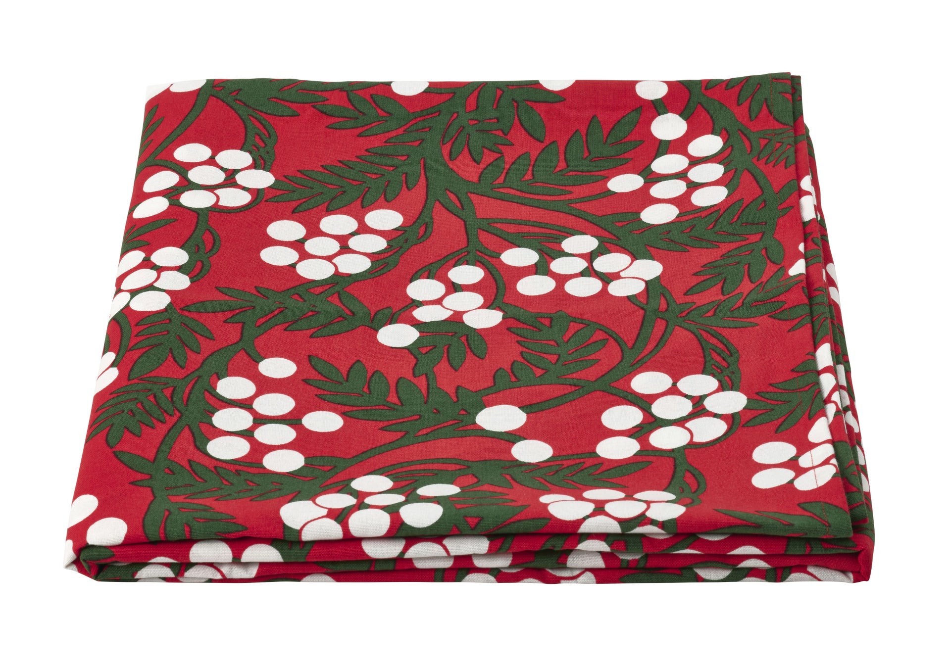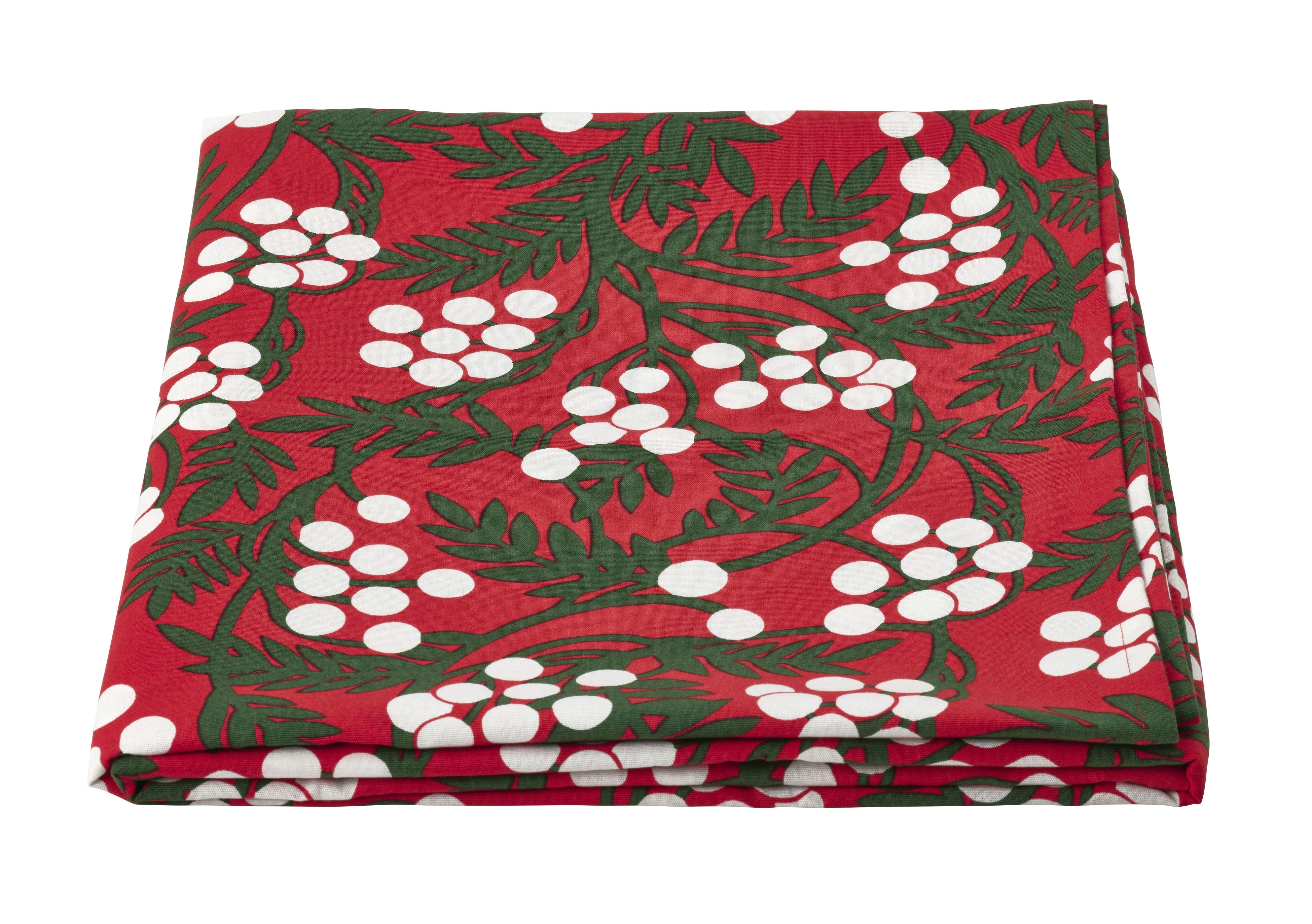 緑の小枝と小さな白いベリーが描かれた鮮やかなレッドのテーブルクロス。クリスマスのテーブルコーディネートをお祝いの雰囲気で縁取ります。綿でできた布地なので、食べ物や飲み物をこぼしても洗濯機で洗えます。