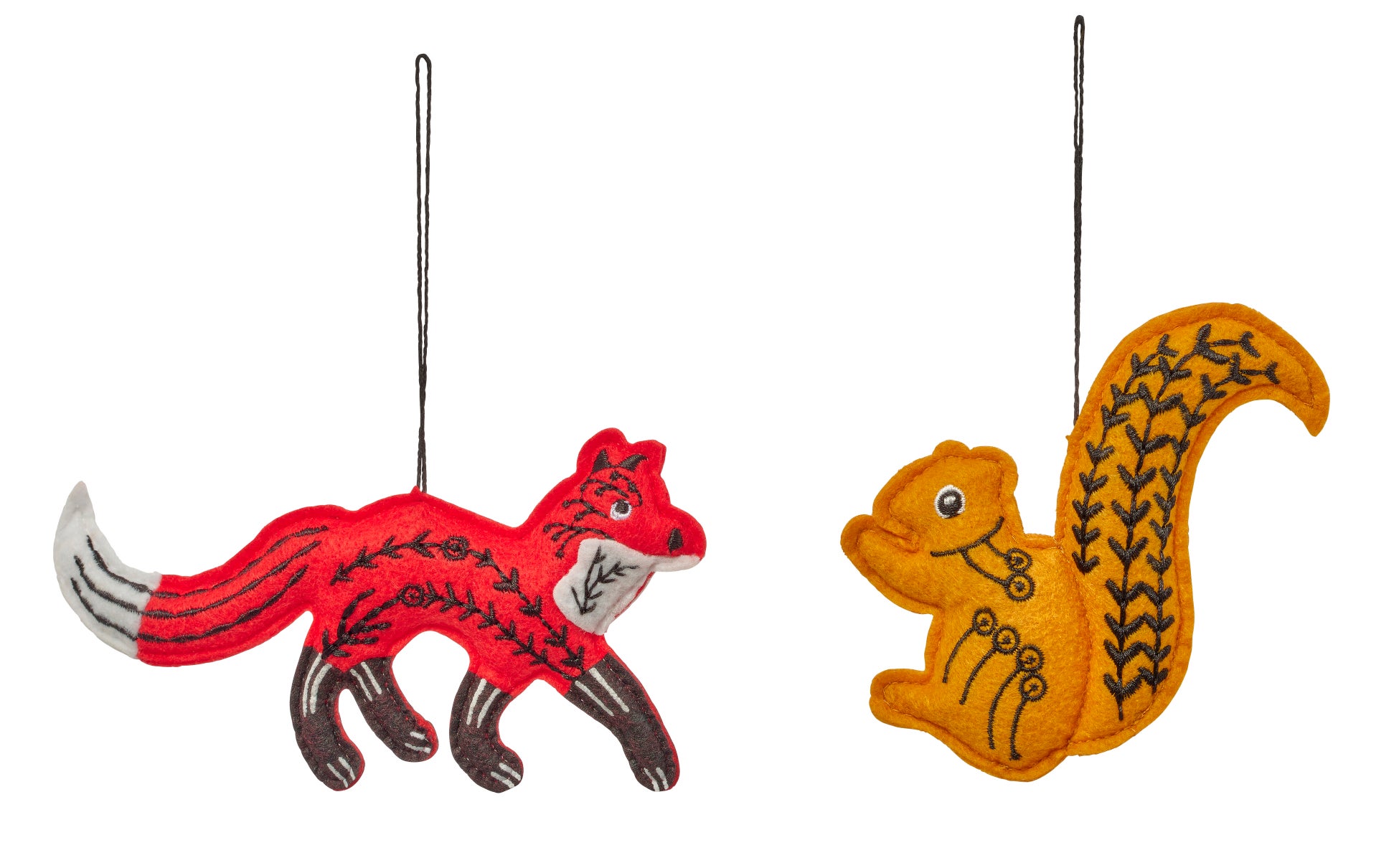 スウェーデンの森にいるかわいらしいキツネとリスを柔らかな布地でつくり、刺繍を施しました。ツリーの飾り付けを手伝いたい子どもたちにぴったりです。