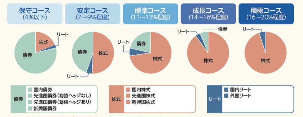 当ファンドは国内外の複数の資産を投資対象とし分散投資するファンドで、5つのファンド(保守コース、安定コース、標準コース、成長コース、積極コース)においてそれぞれの目標リスク水準に応じて資産配分比率を決定します。資産配分比率を決定する際の制約条件を緩和することによって、低リスクから高リスクまで幅広いリスク水準をカバーしており、より安定的な分散投資から積極的な運用まで、幅広いニーズに合わせた商品設計となっています。高水準の目標リスク水準をカバーするため、市場環境によっては資産配分比率が株式100%となる場合があることも当ファンドの特徴です。