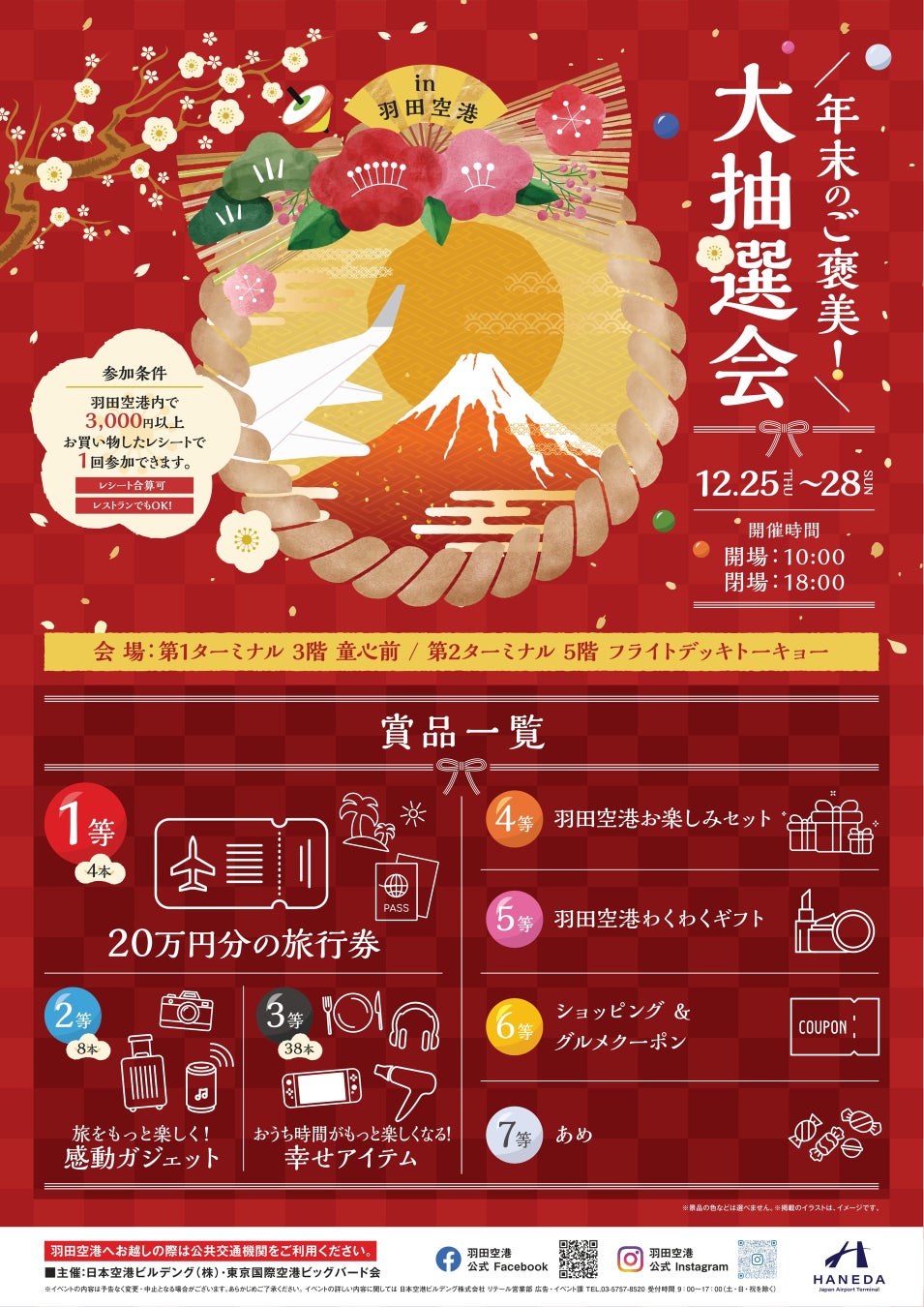 12月25日(木)~28日(日)の4日間、羽田空港第 1・第 2 ターミナルにて、豪華賞品が当たる「大抽選会」を開催します。