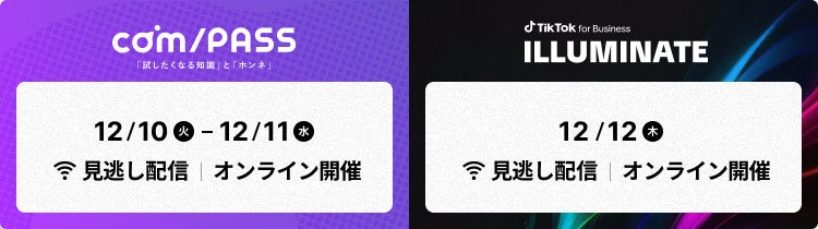 今回の「com/PASS」は、12/12(木)に見逃し配信が開催されるTikTok for Business Japan主催の「ILLUMINATE」との連動企画です。1度のお申込みでどちらのイベントへも参加が可能です。