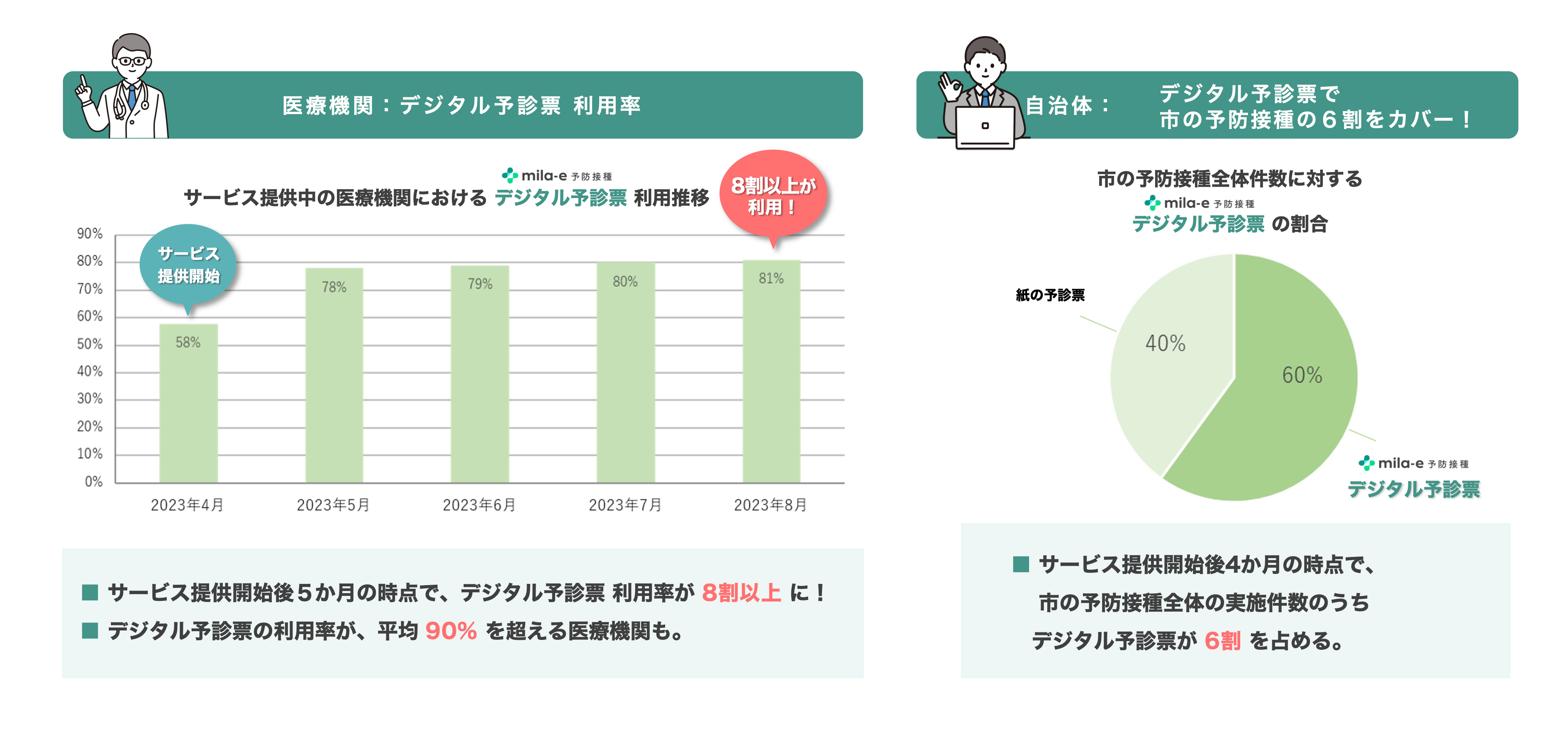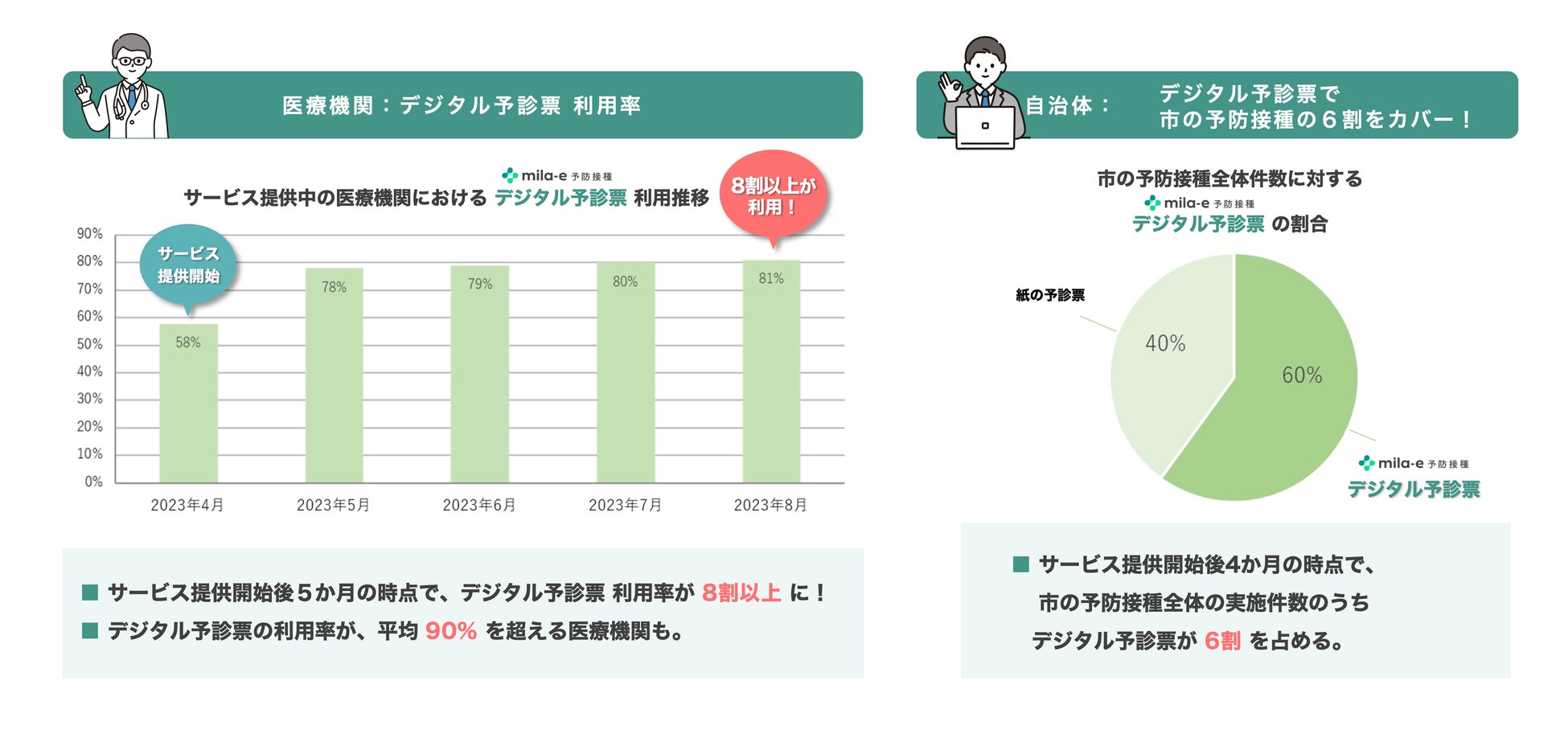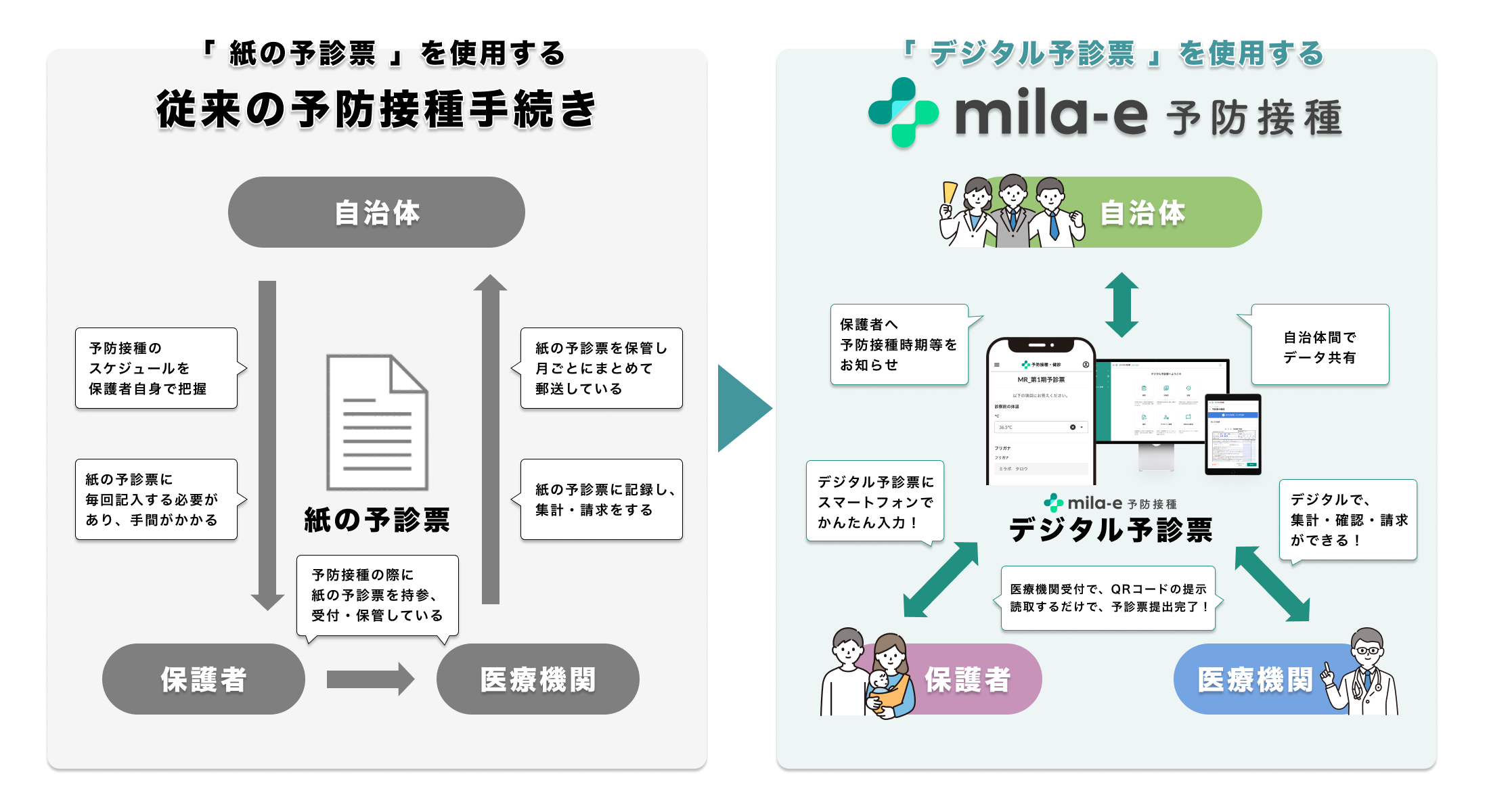 mila-e 予防接種は、乳幼児予防接種 デジタル予診票サービスです。自治体・医療機関・保護者の三者間連携が可能なため、利便性・業務効率向上のほか、接種間隔ミスなどの事故防止につながります。