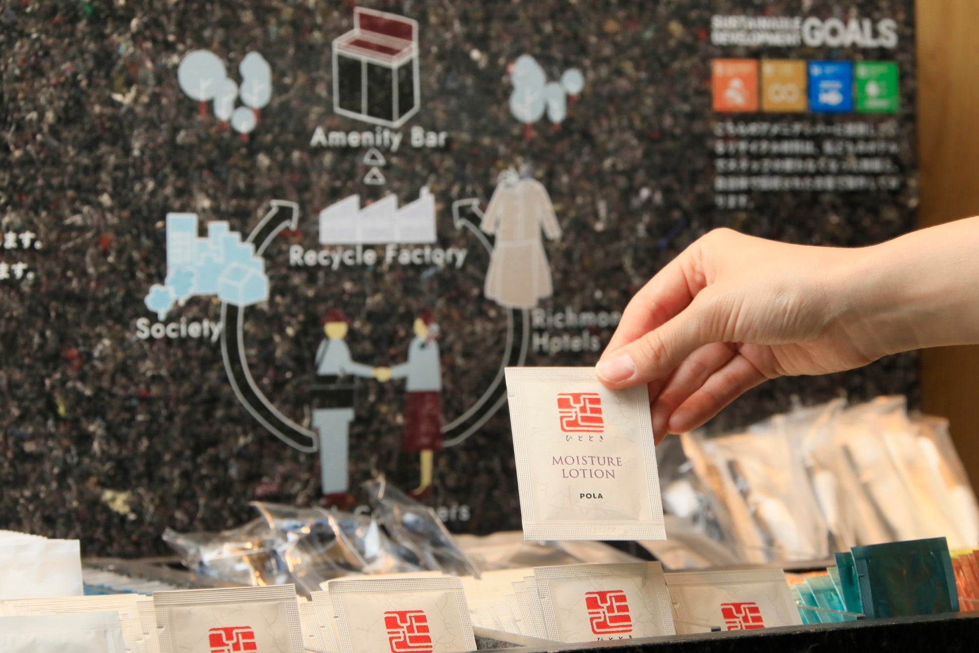 必要なものを必要な分だけ使う、プラスチック使用量削減のためにリッチモンドホテルズでは、選択式のアメニティバーを全43店舗で導入します。アメニティバーの什器には、リッチモンドホテルズの廃棄制服を素材としたパネルを使用し、アップサイクルによる循環型社会実現に貢献いたします。