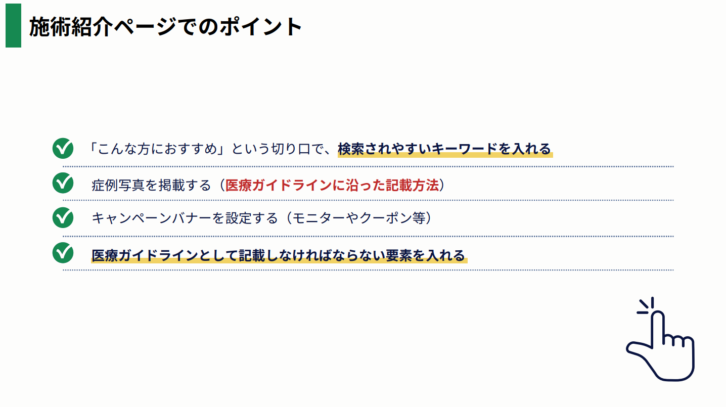 医療法や広告ガイドラインとの適切な対応方法やウェブサイトの改善ノウハウを