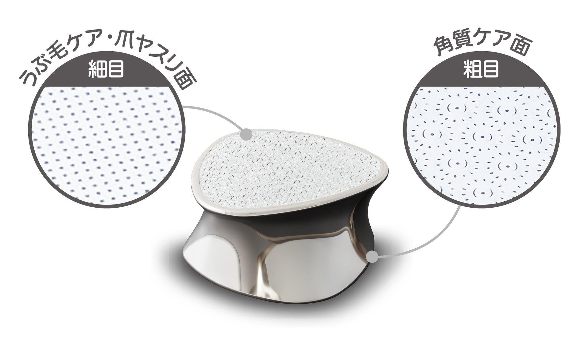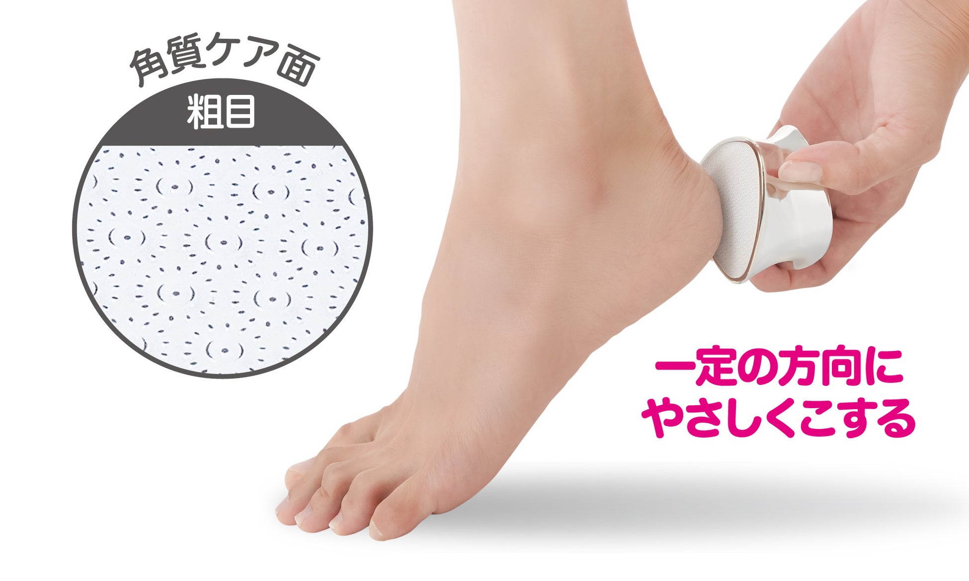 しっかり削れる角質ケア面でくるくる擦ると硬い角質をキレイに除去できます。