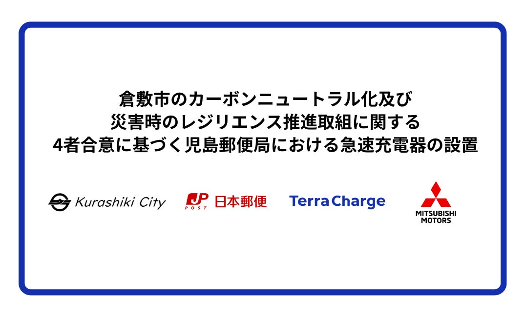 岡山県倉敷市(市長 伊東 香織、以下「倉敷市」)、日本郵便株式会社(東京都千代田区、代表取締役社長兼執行役員社長 千田 哲也、以下「日本郵便」)、Terra Charge株式会社(東京都港区、代表取締役社長 徳重 徹、以下「Terra Charge」)および三菱自動車工業株式会社(東京都港区、代表執行役社長兼最高経営責任者 加藤 隆雄、以下「三菱自動車」)は、4者で合意した「倉敷市のカーボンニュートラル化及び災害時のレジリエンス推進取組」(注)に基づき、取り組みの第一弾として、本日、倉敷市の児島郵便局(以下「児島局」)に、24時間使用可能な有料のEV用急速充電器1台を設置しました。