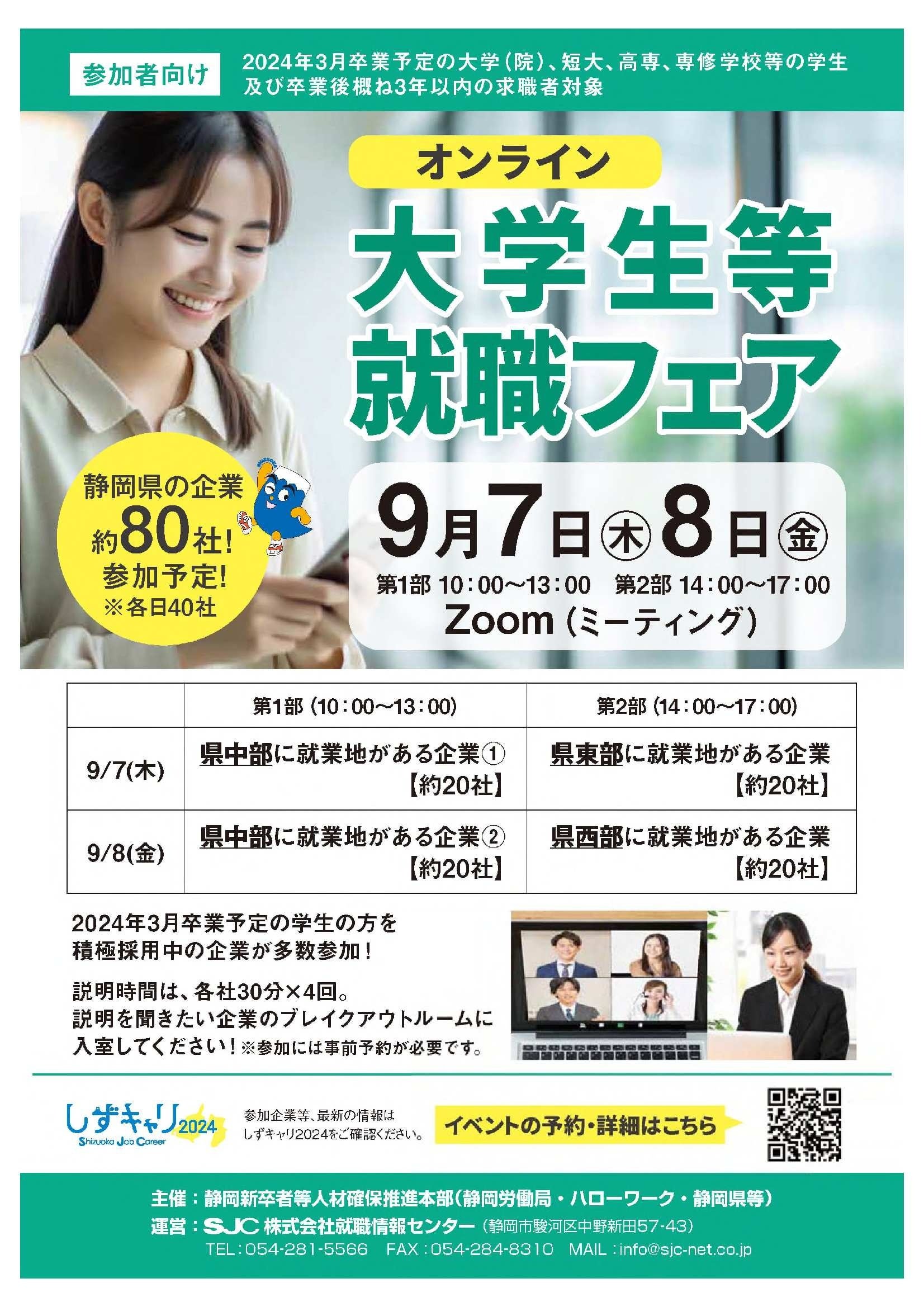 静岡新卒者等人材確保推進本部では、2024年3月卒業予定の大学生及び既卒3年以内の方を対象として、静岡県内に就業地のある企業との企業説明会・就職面接会をオンラインで開催します。